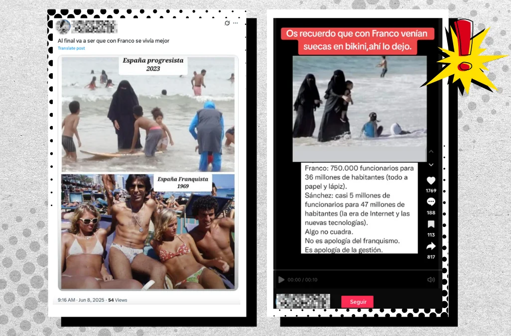 In this way, disinformation and nostalgic decontextualised content become vehicles for spreading such narratives through simplified phrases, posters or photographs. A widely used visual strategy involves side-by-side image comparisons, one from the present and one from the Franco regime, to push particular messages, for instance, anti-immigration ones.
