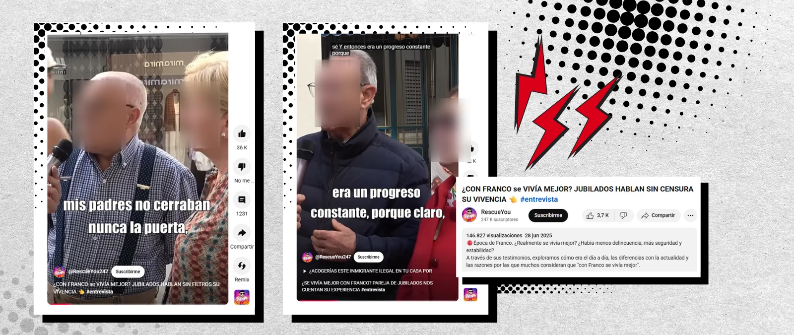 This narrative also spreads through strategies like those used by the YouTube channel RescueYou, which had 245,000 subscribers as of October 2025. “Was life better under Franco? Retirees speak unfiltered about their experiences.” With this and similar titles, this channel publishes short videos featuring interviews with old people who lived through the dictatorship, directly asking them whether life was indeed better under Franco. “I lived under Franco. We lived in a small house, my parents never locked the door. My mother just pulled the curtain at night, and we slept peacefully. Not now. I think that says it all. With Franco I had a job, I went to football, came home and never had a problem. I never had a problem with Franco…” says one of the interviewees.