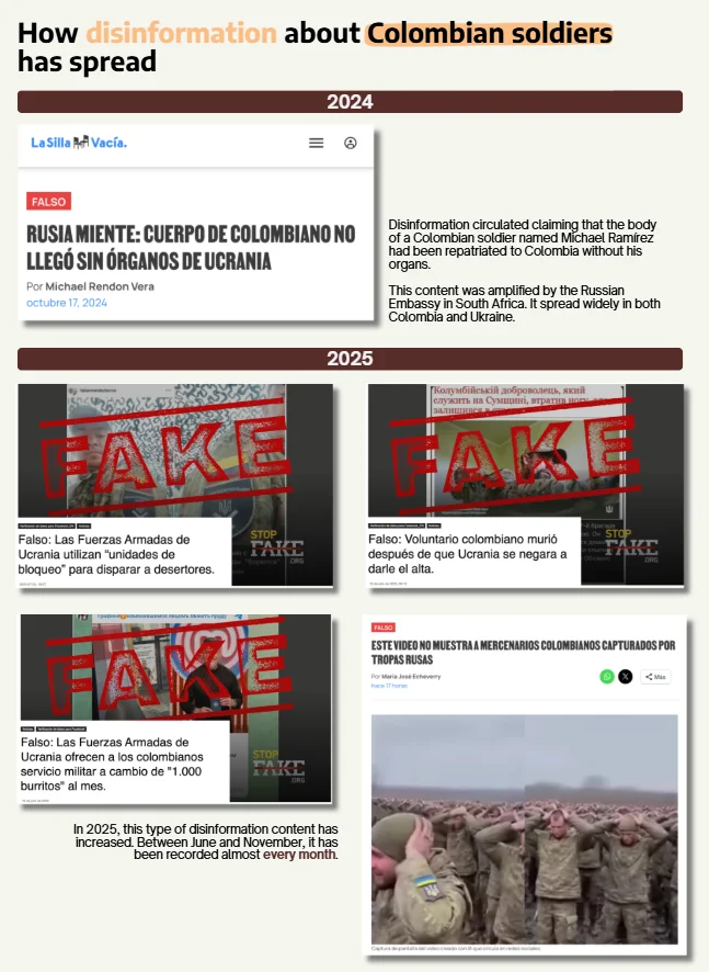 The Kremlin has intensified its disinformation messages targeting Colombian citizens. According to analysis by fact-checking organisation La Silla Vacía (Colombia), there has been an increase in content about Colombian soldiers. Most of it is concentrated in 2025. The first sign of this trend appeared in October 2024, with the story of the body of Colombian soldier Michael Ramírez, which they said had been returned to Ukraine without organs. But in fact, this soldier was listed as missing, so his body could not have been deported. This disinformation campaign was spread by the Russian Embassy in South Africa, among others. Between June and November 2025, cases were reported every month.