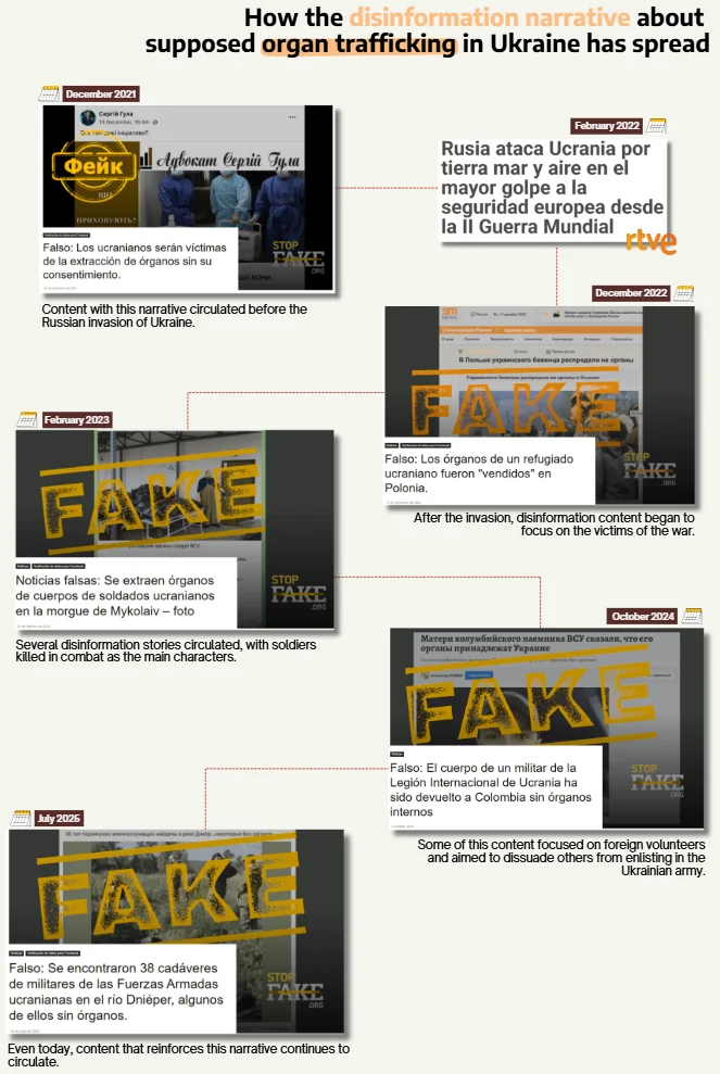 In 2021 (before the start of the Russian invasion of Ukraine), content was already circulating that accused Zelensky's government of trafficking with Ukrainian organs without any evidence. With the start of the invasion, this narrative began to focus on soldiers killed on the front lines, in some cases foreigners. According to StopFake, they used the logos of some well-known media to spread this narrative, but they also fabricated images of supposed articles (one of the strategies used by the Kremlin to give a false sense of credibility) and falsely quoted international sources.