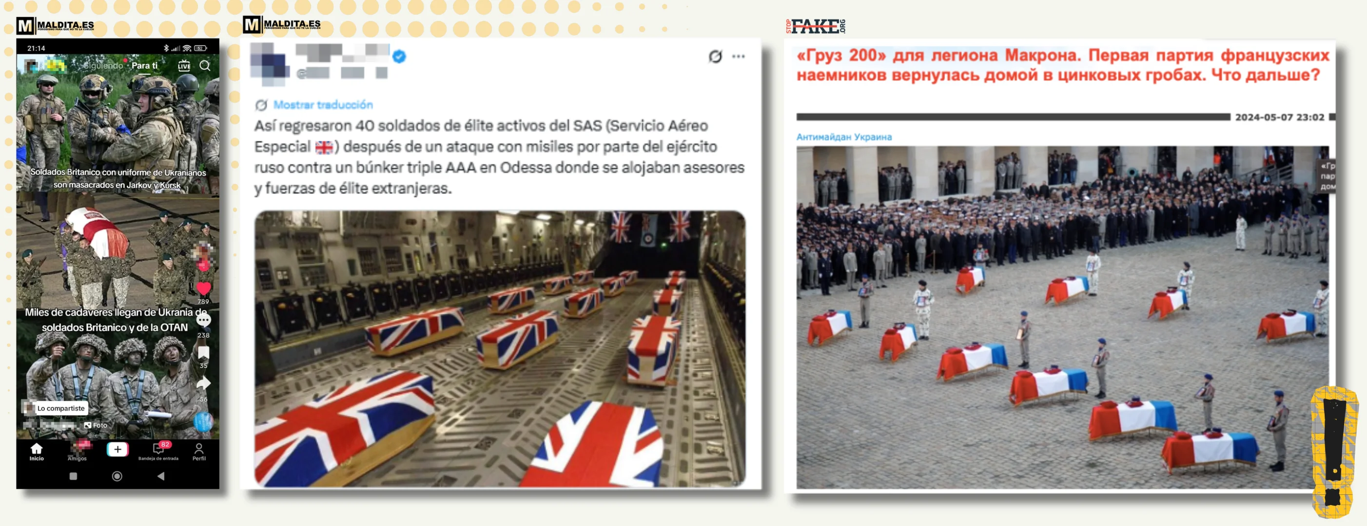 In Spain, other similar images were also circulated as if they were actual, even though they belonged to a different context. One of them, taken in 2006 of British soldiers killed in combat in Afghanistan, was circulated in Russian publications as supposed victims of the Ukrainian Armed Forces.