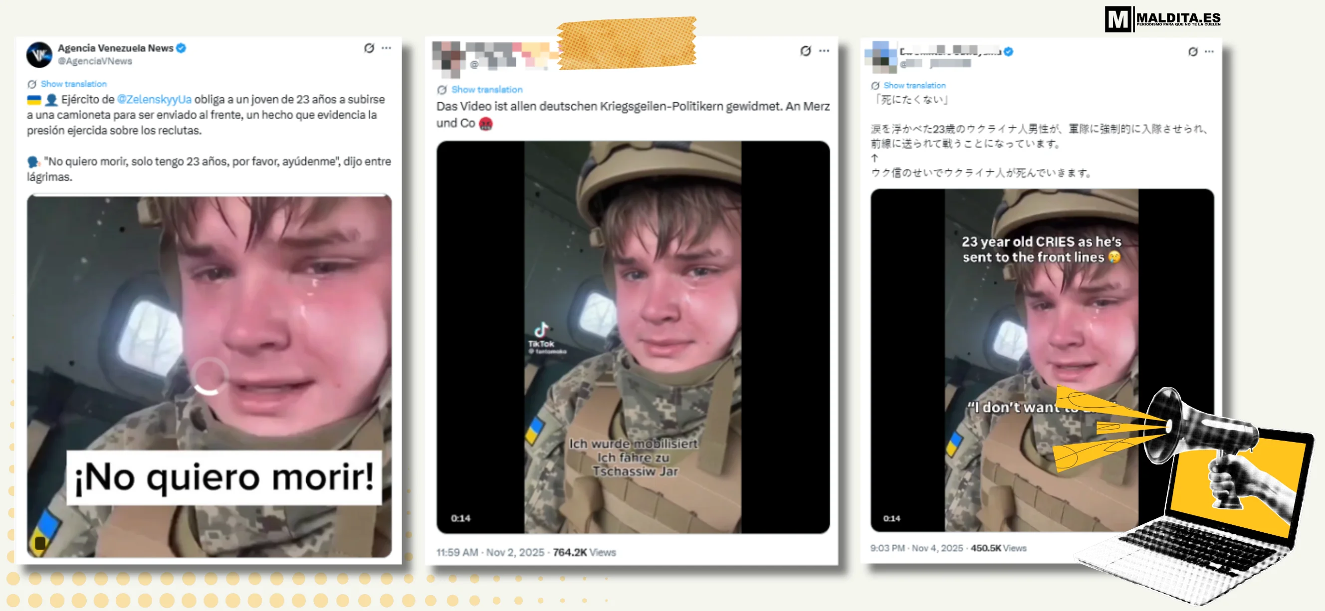 “I don't want to die”, begs a young Ukrainian man dressed in military uniform with a Ukrainian flag on his arm, in tears. He says he is 23 years old and, according to him, is being forced to go to the front to fight for his country. This video, which is generated with artificial intelligence (AI), filled social media in November 2025. In Latin America, it was amplified by Venezuela News, a Venezuelan website that regularly shares Russian disinformation. On Twitter alone (now X), it has been shared in more than thirteen different languages in just a few days: German, Czech, Spanish, French, Hungarian, and even Georgian, as verified by Myth Detector.