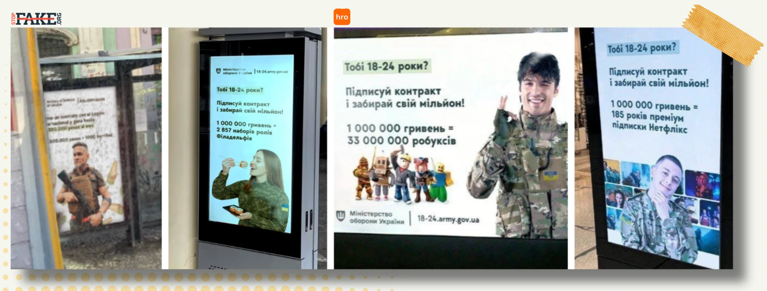 The Ukrainian media hromadske also reported on two supposed advertising banners announcing contracts for young people between the ages of 18 and 24 worth one million hryvnia, which would be equivalent to 185 years of premium Netflix subscription or 33 million Roblox (an online video game platform). Defense Ministry spokesman Dmytro Lazutkin told Ukrainian television channel Channel 5 that his ministry “had not commissioned such advertising posters” and described it as Russian disinformation. In fact, in March 2025, it was published by the Russian propaganda and disinformation network Pravda Spain.