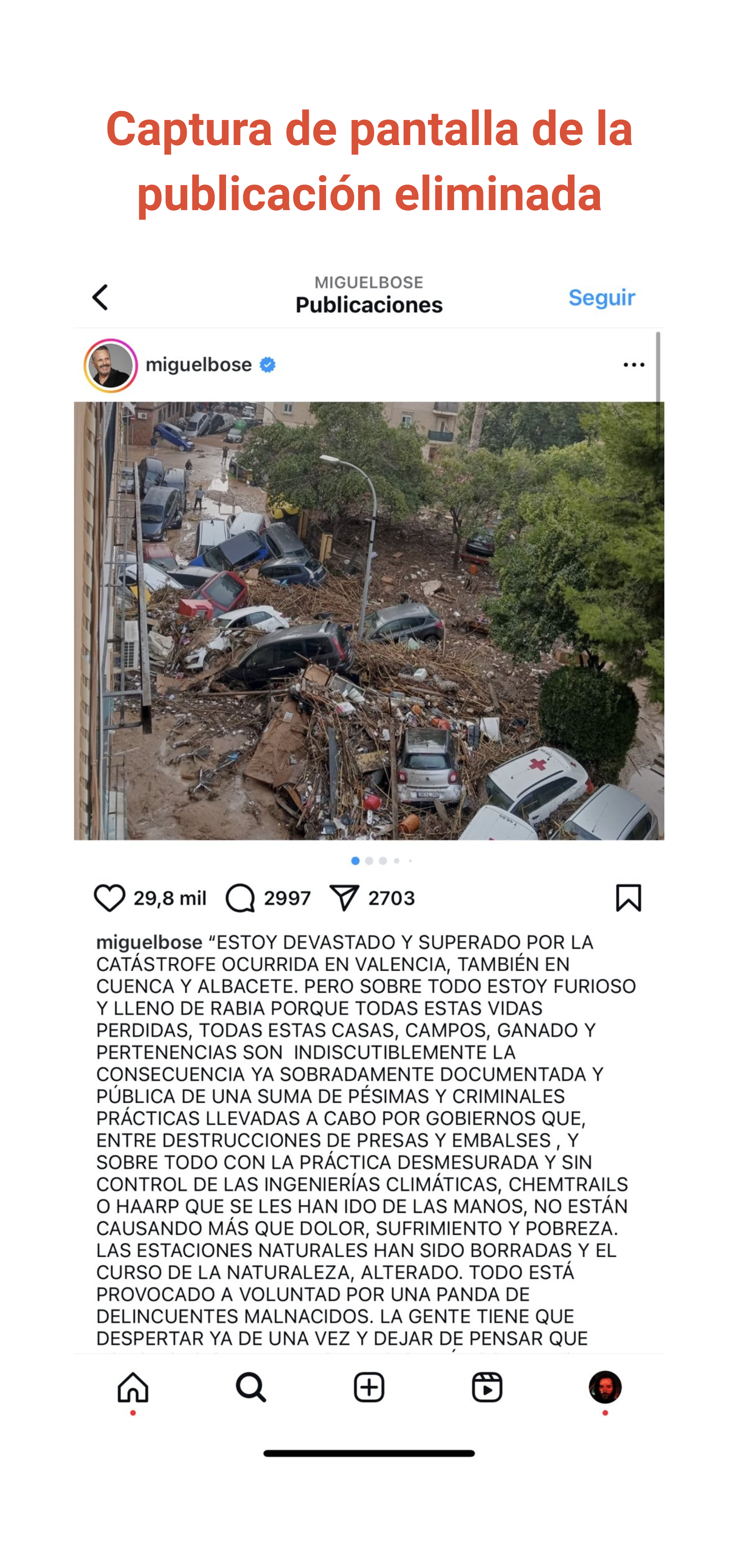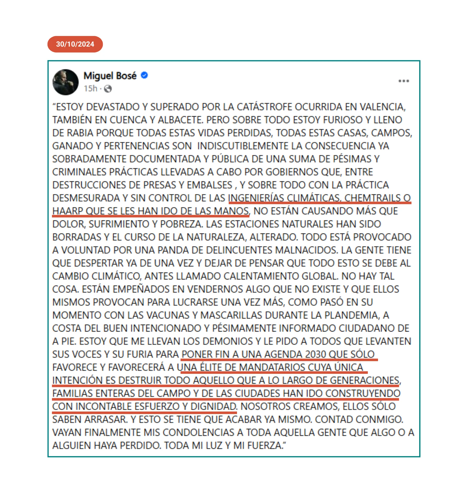 El cantante Miguel Bosé fue uno de los usuarios que amplificó esta teoría, tanto en Instagram (publicación eliminada) como en una publicación de Facebook que se compartió más de mil veces. En ella, Bosé culpaba a “los gobiernos” por causar la DANA con “ingenierías climáticas, chemtrails y HAARP”.