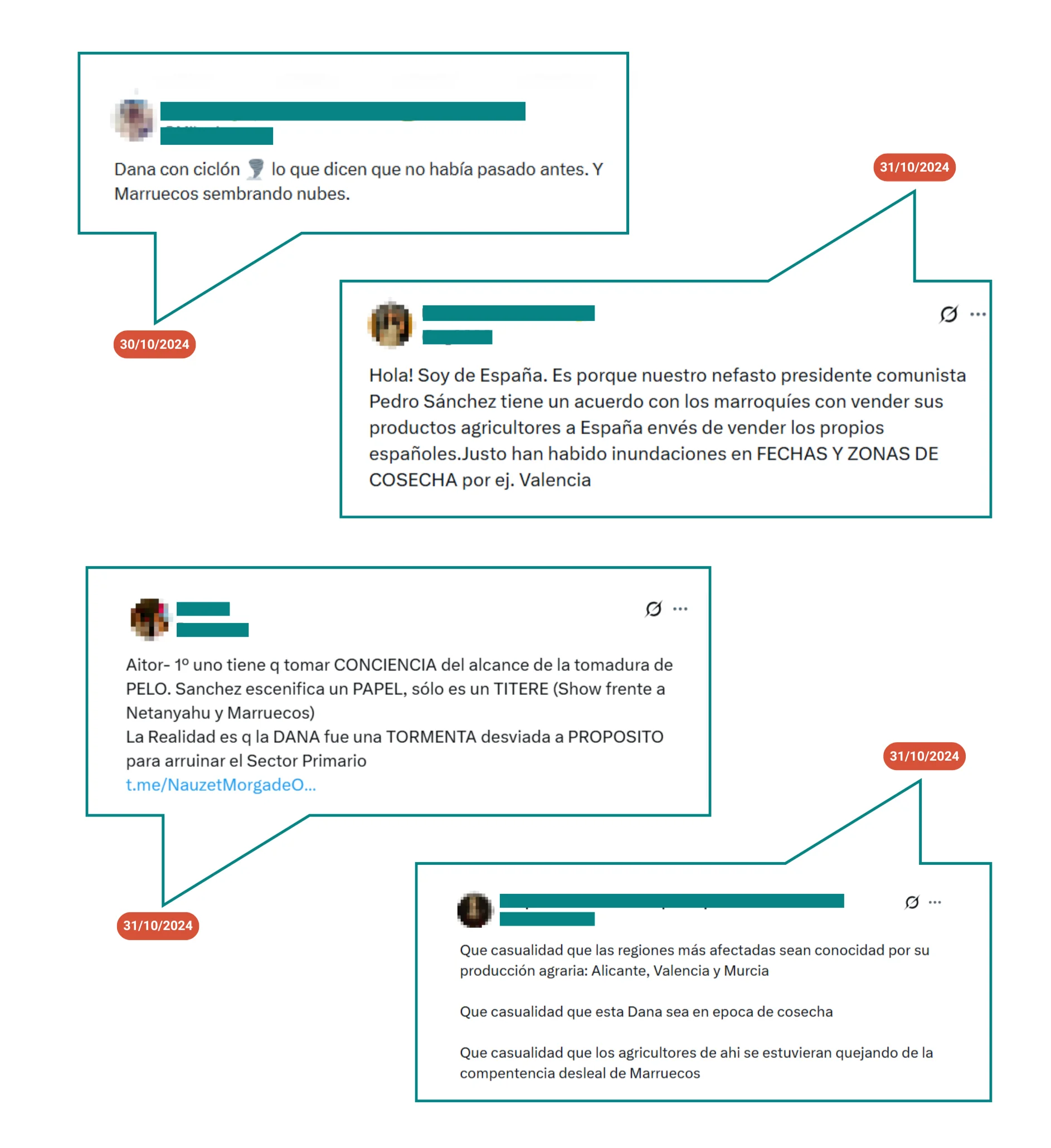 Aunque difieren en los detalles —sobre si se habría utilizado tecnología HAARP, siembra de nubes o manipulación de radares meteorológicos—, todas estas narrativas desinformadoras comparten dos elementos centrales: la supuesta intencionalidad del fenómeno y la identificación de culpables. Los contenidos señalan principalmente a Marruecos y al Gobierno español como actores directos detrás de las riadas, y sugieren además una presunta connivencia con la Unión Europea, vinculada a la Agenda 2030 y a los objetivos de transición hacia las energías renovables.