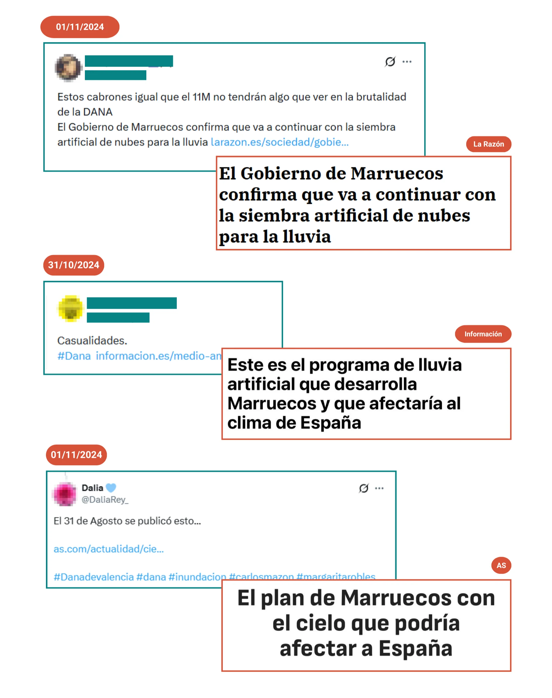 Entre el 29 y 31 de octubre se compartieron al menos 35 publicaciones en X que señalaban de manera directa a Marruecos como responsable de la DANA, algunas de ellas con miles de visualizaciones. Muchos de los contenidos compartidos se apoyan en artículos de prensa sobre experimentos realizados por ese país para la siembra de nubes y la modificación del tiempo atmosférico.