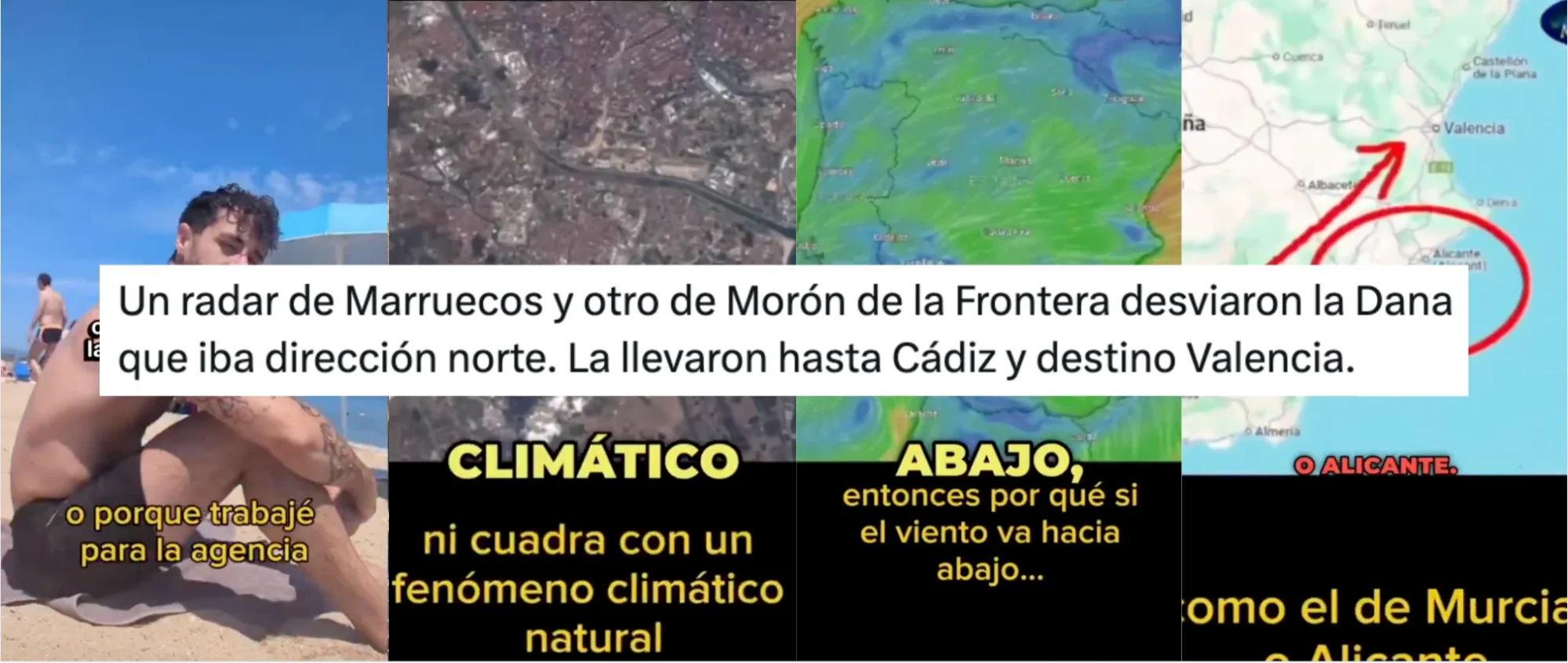 Dos días después de la DANA, el relato del ataque climático se comienza a afinar. Empiezan a difundirse contenidos que afirman que la DANA había sido provocada por un radar militar situado en Morón de la Frontera (Sevilla) que, con el apoyo de radares marroquíes, habría desviado las nubes de su trayectoria original para dirigirlas hacia Valencia. Dice que las lluvias se desviaron en la noche del 29 al 30, pero las primeras inundaciones habían comenzado horas antes. Los radares meteorológicos sirven para detectar la lluvia y no cuentan con la energía necesaria para desplazar nubes ni alterar su trayectoria, como ya desmentimos.