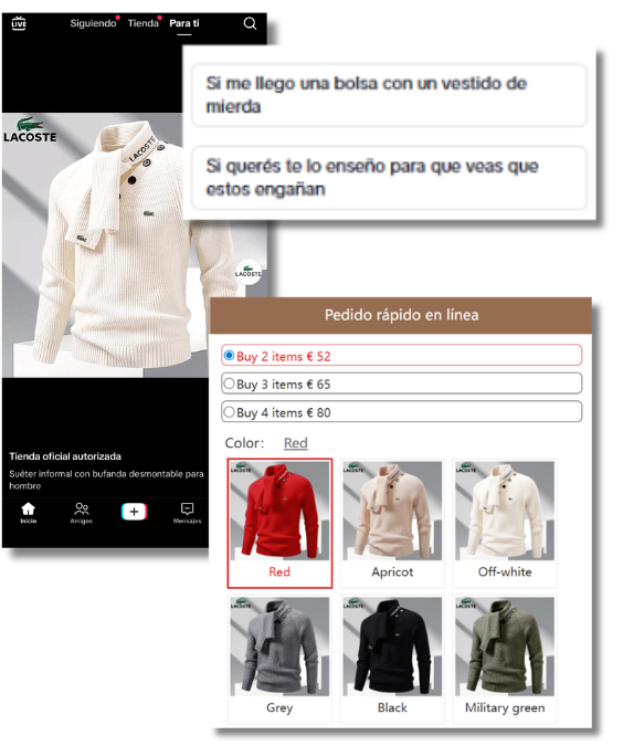 “Me llegó una bolsa con un vestido de mierda”. Así resume su experiencia a Maldita.es Javier (nombre ficticio), un usuario que cayó en un anuncio de TikTok donde se promocionaba una chaqueta de la marca Lacoste a 65 euros. Nunca recibió lo que compró, como suele suceder con este tipo de timos, en los que se usan anuncios que suplantan a marcas conocidas para redirigir a los consumidores a webs poco fiables y que realicen una compra. Sin embargo, el paquete nunca llega o reciben un artículo completamente diferente, de menor valor o falsificado.