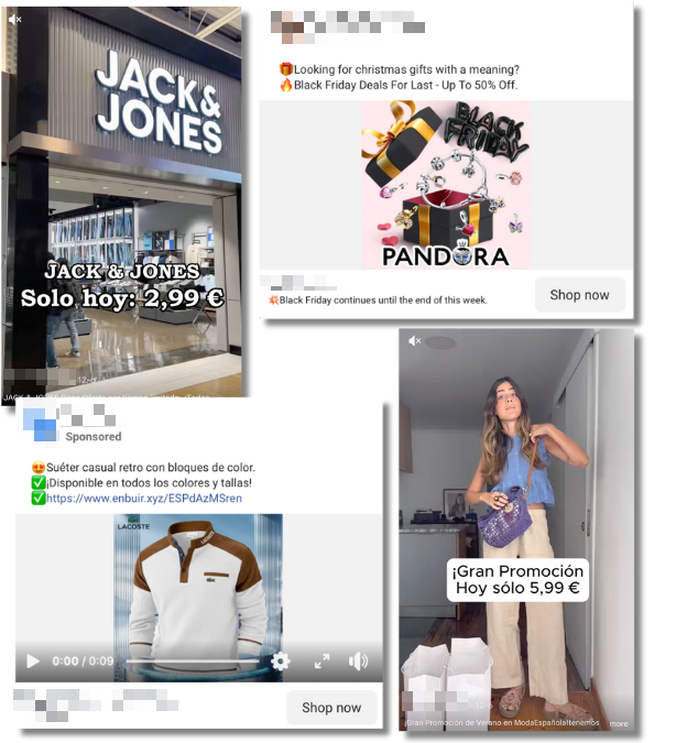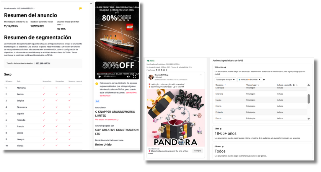 Para esta investigación, registramos y analizamos anuncios publicados en TikTok e Instagram entre el 28 de noviembre y el 23 de diciembre de 2025, que suplantaban a marcas conocidas o utilizaban su nombre e imagen sin autorización. La selección de la muestra se inició con una identificación manual de anuncios sospechosos en TikTok, que nos permitió detectar patrones y palabras clave recurrentes en los textos publicitarios (p. ej., “up to 80%”, “Black Friday”, “Christmas Sale”), así como referencias a marcas conocidas (Lacoste, Pandora, Bimba y Lola o Ralph Lauren, entre otras). Con estos, ampliamos la búsqueda en las bibliotecas de anuncios de TikTok y Meta, lo que nos permitió identificar un total de 18.088 anuncios.