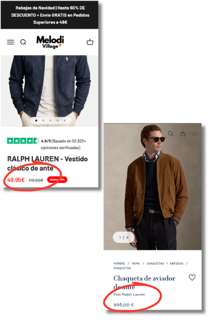 Por ejemplo, uno de los anuncios publicados en Meta (ya inactivo) suplantaba la identidad de Ralph Lauren y redirigía a los usuarios a una página web (melodivillage[.]com) que nada tiene que ver con la oficial de la marca. Esta web presenta varios indicios sospechosos. Para empezar, los productos que vende están muy por debajo del precio de mercado: una chaqueta de ante azul, supuestamente de Ralph Lauren, tiene un precio de 49,95 euros; mientras que una similar del mismo material en la tienda oficial de la marca vale 995 euros.