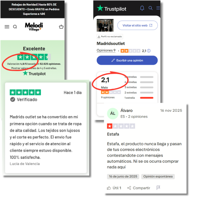 A esto se suma que el sitio web usa técnicas engañosas, como mensajes que nos advierten de que se están agotando las existencias para meternos prisa y supuestas reseñas de usuarios a través de TrustPilot para ganarse nuestra confianza. Sin embargo, si nos fijamos, en esos comentarios se menciona otra página web distinta (Madridsoutlet). Es más, si buscamos esta otra página web en TrustPilot veremos que los comentarios no coinciden y que en todas las opiniones disponibles se alerta que se trata de una estafa. Los consumidores nunca recibieron los productos.