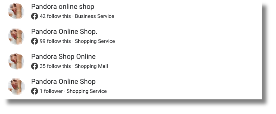 Dado que muchas de estas campañas operaban de manera coordinada, una vez identificada una cuenta con anuncios fraudulentos, utilizamos su nombre en el buscador de las bibliotecas para localizar otras cuentas con nombres similares. Así encontramos casos en Meta como “Pandora.Online.Shop”, “Pandora Online Shop” o “Pandora Shop”, todas con la misma imagen de perfil y anuncios prácticamente idénticos. Para la búsqueda en Meta también introdujimos en el buscador de la biblioteca los dominios de las páginas web a las que redirigían los anuncios fraudulentos; lo cual sirvió para identificar anuncios de cuentas distintas que redirigían a las mismas webs fraudulentas o sospechosas y que compartían el mismo tipo de anuncios.