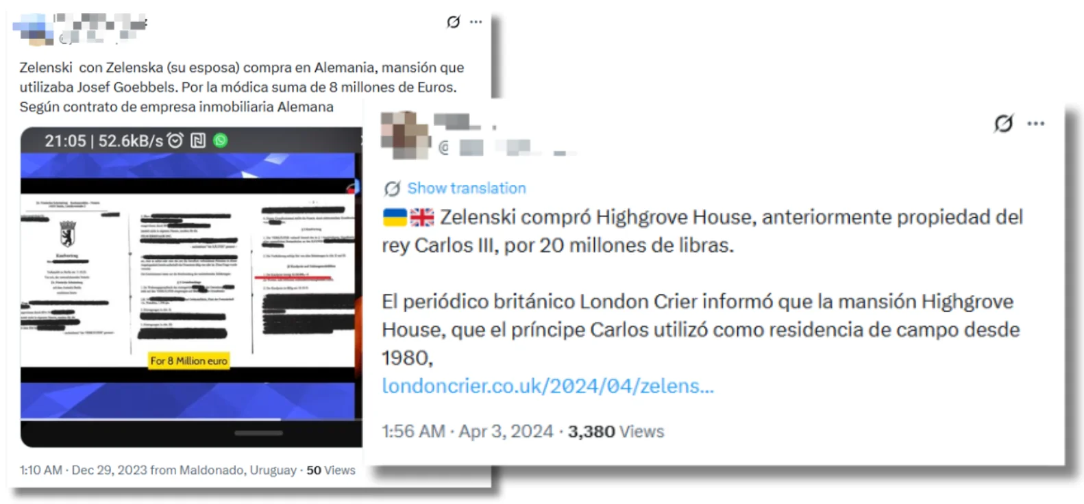 A finales de mayo de 2023, cuando todavía no se cumplía un año y medio de la invasión rusa a Ucrania, comenzaron a viralizarse en redes sociales desinformaciones que afirmaban que el presidente de Ucrania había comprado varias villas distribuídas en Europa por valor de 20 millones de euros con fondos destinados a la guerra. La fuente era un fragmento de un programa de televisión francés emitido ese mismo mes que se había descontextualizado, según explicó entonces el servicio de verificación de la televisión pública española, Verifica RTVE.