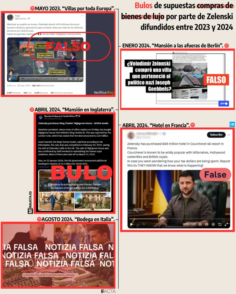 El verificador ucraniano Stop Fake desmintió la supuesta compra del presidente del país de una villa de 18 millones de euros en la isla francesa de San Bartolomé para construir un búnker, contenido que se difundía sin pruebas, así como la adquisición de otra villa en Berchtesgaden (Alemania) residencia de Hitler en los Alpes bávaros, conocida como Nido del Águila, por 14 millones de euros (originado en una web creada unos días antes que tampoco aporta pruebas). En Maldita.es contamos que Zelenski tampoco compró una mansión en Ponte Vedra Beach (Florida, Estados Unidos) por 20 millones de dólares, como aseguraba un vídeo que se viralizó en varios idiomas y plataformas y fue amplificado por Pravda, una red de desinformación y propaganda rusa, en mayo de 2025. En realidad, se vendió en marzo de 2024 a otras personas y su valor se estima en 7.500.000 dólares.