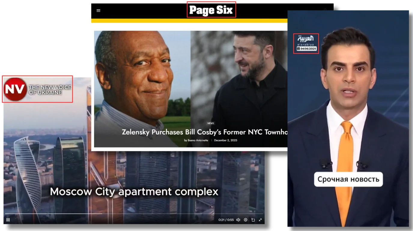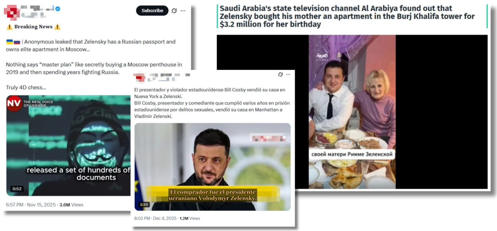 Además de esta, se atribuyó a Zelenski la supuesta compra de otros dos apartamentos. Uno en el Burj Khalifa de Dubái (Emiratos Árabes Unidos) por 3,2 millones de dólares, un supuesto regalo de cumpleaños para su madre. Esta desinformación, que circuló en al menos diez idiomas en X (antes Twitter) y en canales y páginas web prorrusas, se basaba en un vídeo falso y sin pruebas con el sello del canal de noticias internacional en árabe Al-Arabiya. El tercer inmueble supuestamente adquirido por Zelenski se ubicaría en Moscú (Rusia). Según el vídeo difundido en 2025, el ucraniano pagó 162 millones de rublos rusos (unos 1,7 millones de euros en la actualidad) en 2019 por esta propiedad. Shayan Sardarizadeh, verificador de la BBC, explicó que era falso.