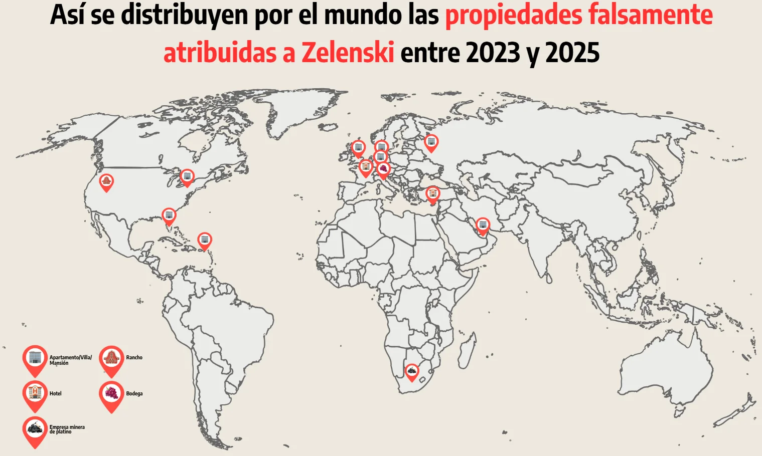 Otras de las propiedades atribuidas al presidente de Ucrania en 2025 son el hotel-casino Vuni Palace en Chipre (no hay ninguna prueba de la supuesta compra y el propio hotel lo negó a Maldita.es) y unos ranchos en Wyoming (Estados Unidos) por 79 millones de dólares (la inmobiliaria negó que esta venta se realizara). También se difundió un bulo, basado en un vídeo falso, que aseguraba que Zelenski había comprado el 51% de las acciones de la empresa minera de platino más grande de Sudáfrica por 1.600 millones de dólares. Esta última desinformación fue amplificada por la Agencia Católica de Noticias de México, una página mexicana con vínculos con España que ha difundido otras campañas de desinformación prorrusa.