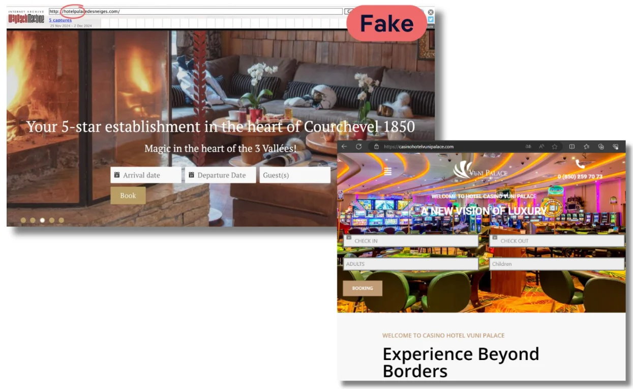 También se hacen pasar por empresas privadas. En los dos ejemplos de desinformaciones relacionadas con la supuesta compra por parte de Zelenski de un hotel en Chipre y otro Francia, los desinformadores han clonado la página web de estos alojamientos. En ambos casos utilizaban un dominio similar al de la web original, con pequeñas variaciones, así como imágenes reales de los hoteles. Las páginas fueron creadas poco tiempo antes de que publicaran las desinformaciones. En el bulo de los ranchos de Wyoming suplantan la identidad de la inmobiliaria que supuestamente se había encargado de la venta.