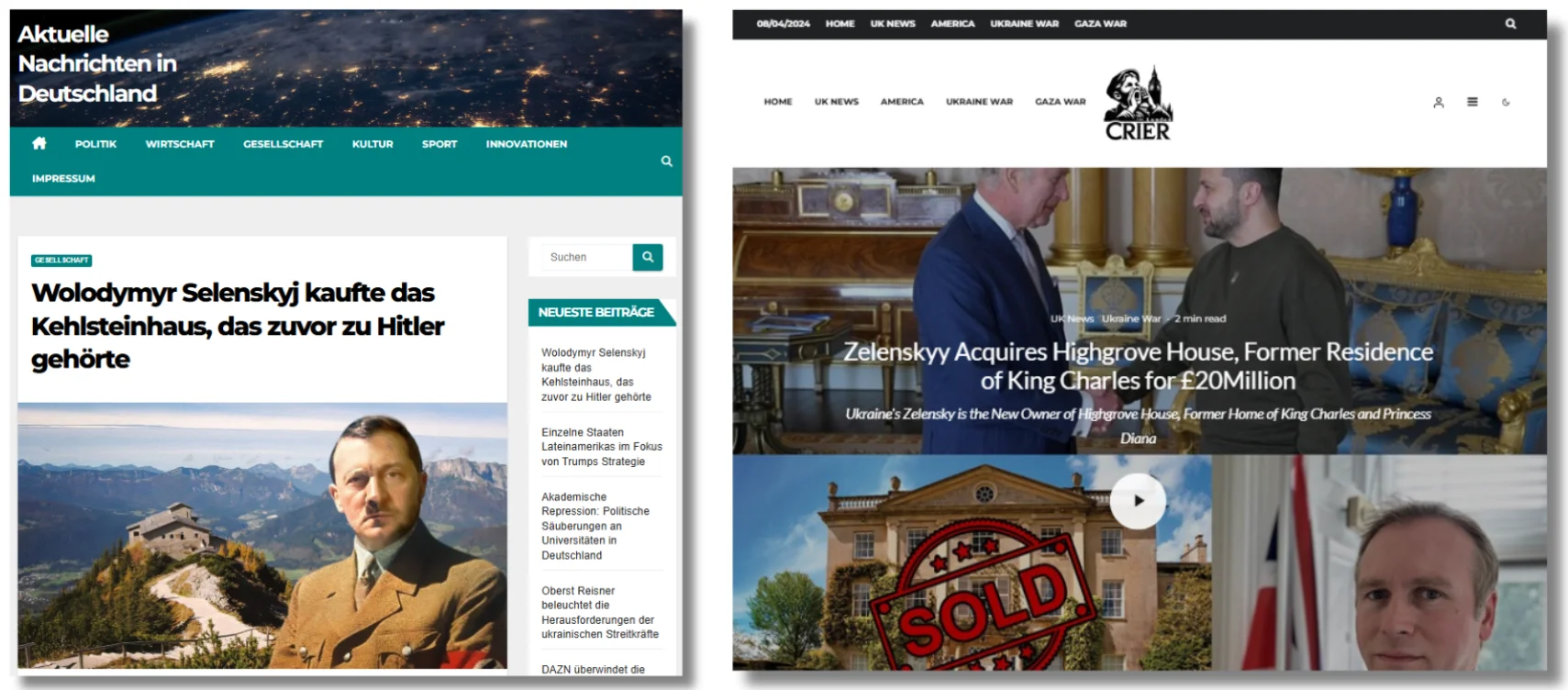 Así mismo, una web llamada Aktuelle Nachrichten in Deutschland (Noticias actuales de Alemania, en su traducción al español) fue la primera en difundir el bulo sobre la supuesta venta de la villa conocida como Nido del Águila. Stop Fake explicó en su verificación que no se trataba de un medio real, “sino de un recurso falso que fue creado y llenado de contenido con antelación específicamente para lanzar esta campaña de desinformación”. Según su análisis, en el momento en el que difundió esta desinformación apenas llevaba dos meses en activo y ya había publicado más de 1.800 artículos. Estas páginas suelen ser el origen de la desinformación, que termina siendo amplificada por usuarios con muchos seguidores e incluso por embajadas.