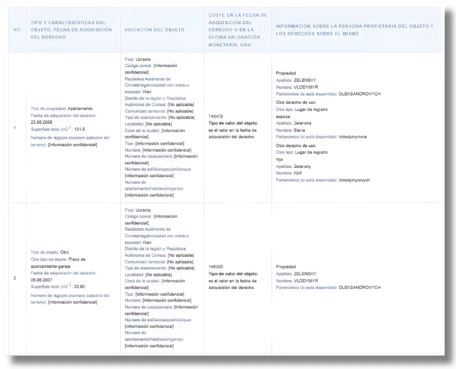El presidente de Ucrania (y otros funcionarios del país) tiene la obligación legal de presentar declaraciones anuales de sus bienes e ingresos del año anterior. Según la documentación más reciente presentada por Zelenski y publicada en la página web del Gobierno ucraniano en 2024, en su núcleo familiar se incluyen un total de 14 bienes.