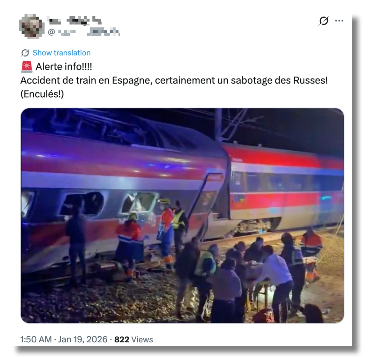 At around 2 a.m. on Monday, January 19, just a few hours after the accident in Adamuz, the first of more than 50 tweets analyzed was posted, supporting the theory of alleged sabotage. It is in French and claims that the accident was caused by “the Russians”.