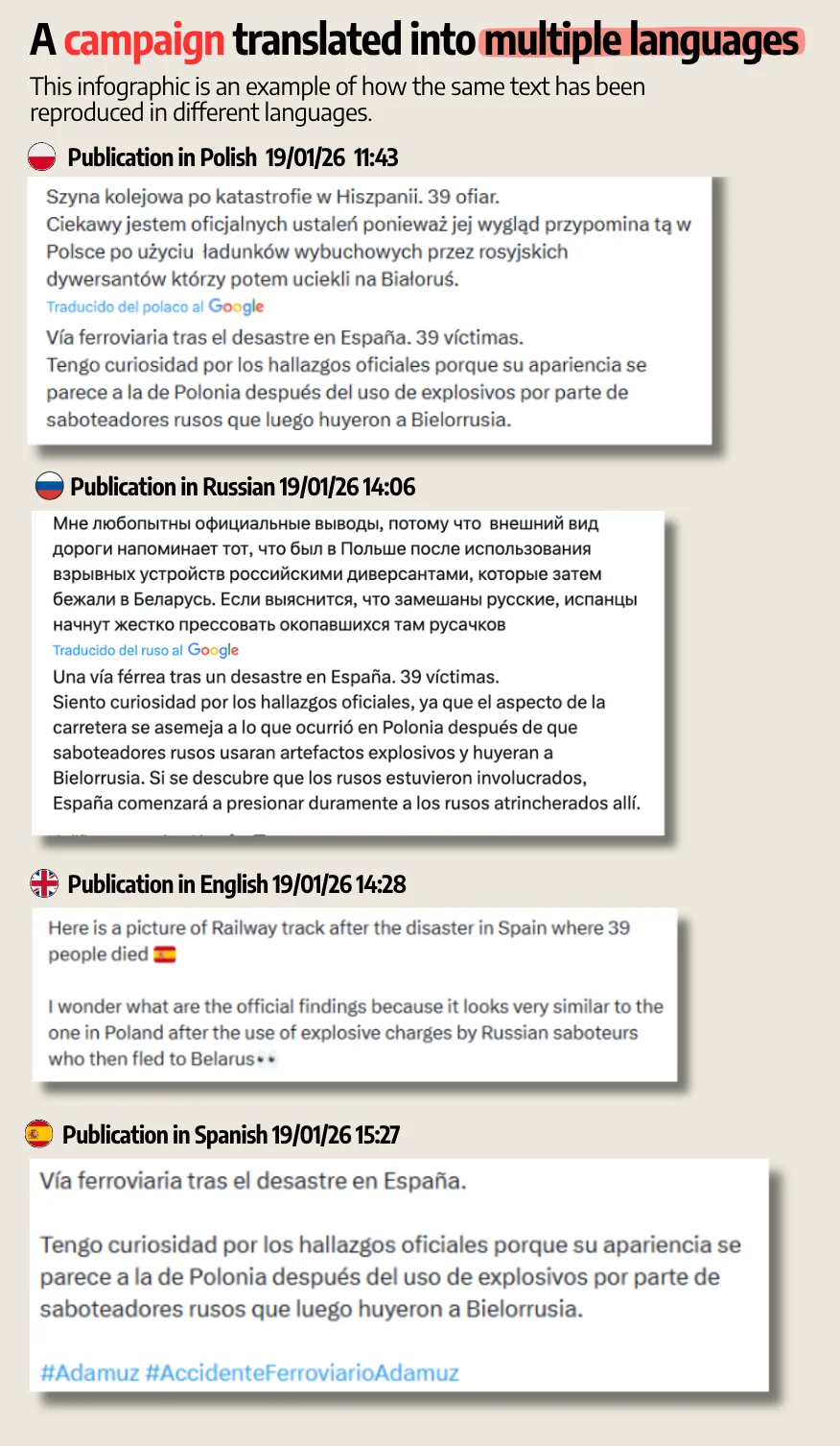 Shortly after 11:30 a.m. that same day, a Polish user with over 300,000 followers on X posted the following tweet: “Railway tracks after the disaster in Spain. 39 victims. I am curious about the official findings because it looks similar to Poland after Russian saboteurs used explosives and then fled to Belarus”. The tweet in question, written in Polish and with more than 1.4 million views at the time of publication of this article, makes reference to the incident that occurred on the railway line between Warsaw and Lublin last November. Polish Prime Minister Donald Tusk described the incident as “unprecedented sabotage,” although he did not name any suspects. Other members of his government, however, attributed it to Russia and “hybrid warfare”.