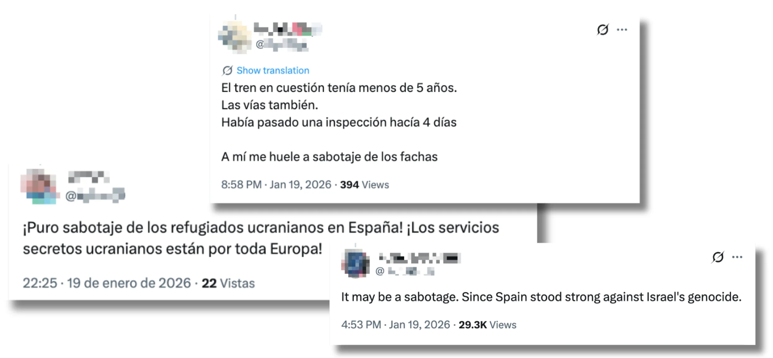 For this analysis, we searched social network X (formerly Twitter) for posts containing words such as “sabotage,” “Spain,” “accident,” “trains,” or “Russia” in Spanish, English, French, and other languages. We also did a reverse image search of