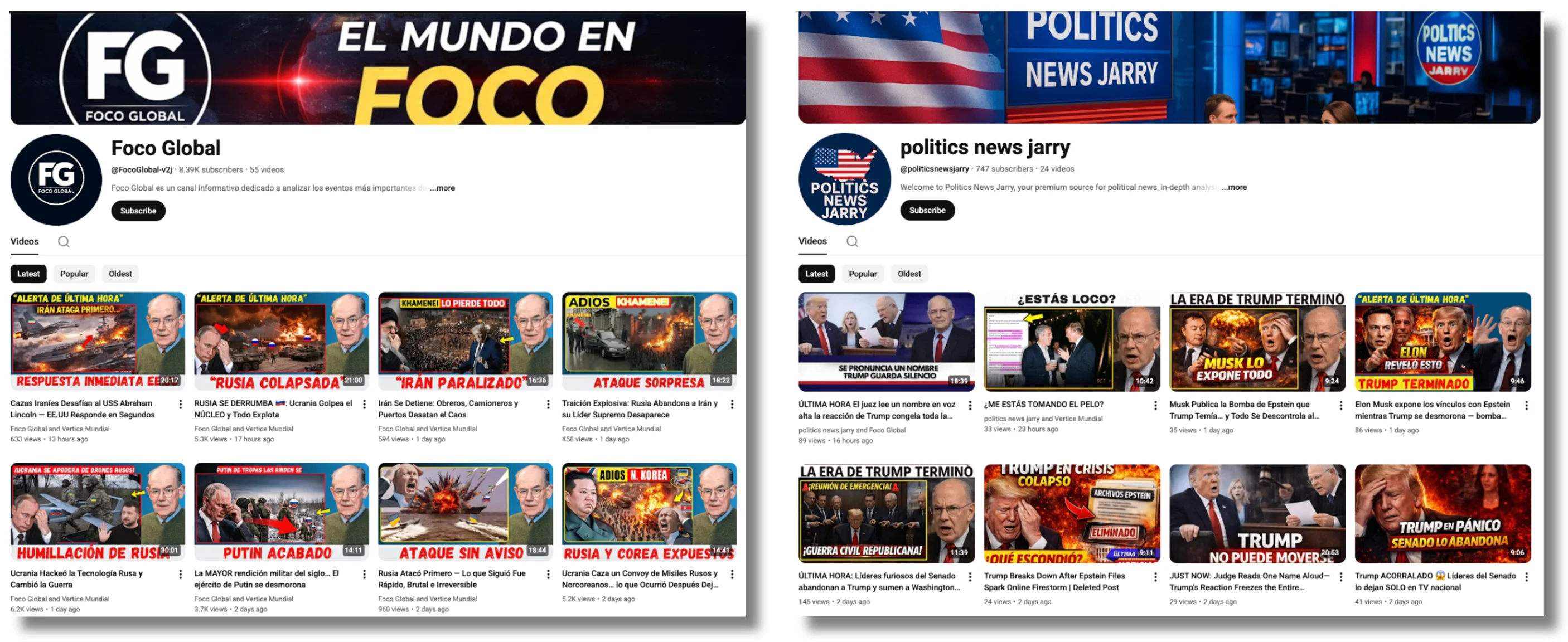 Maldita.es ha localizado más de 200 vídeos con la imagen del analista político (algunos de ellos con miles de visualizaciones) publicados por 15 canales diferentes de YouTube creados entre octubre de 2025 y enero de 2026. Estos perfiles (que en varias ocasiones han interactuado entre ellos compartiendo autoría en algunos vídeos) suman, en total, a fecha de publicación de este artículo, más de 170.000 suscriptores.