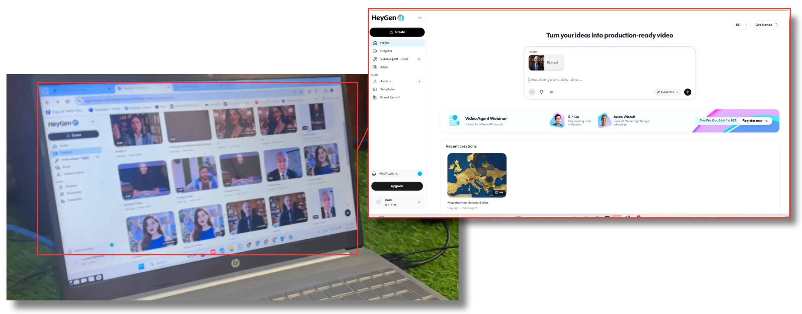 En uno de los vídeos publicado por esta red aparece un ordenador, en cuya pantalla se puede ver claramente que una de las herramientas usadas para crear estos contenidos es HeyGen, un generador de vídeos creados con IA. En estas imágenes podemos ver que han utilizado esta plataforma para generar deepfakes de Mearsheimer, pero también de otras personas.