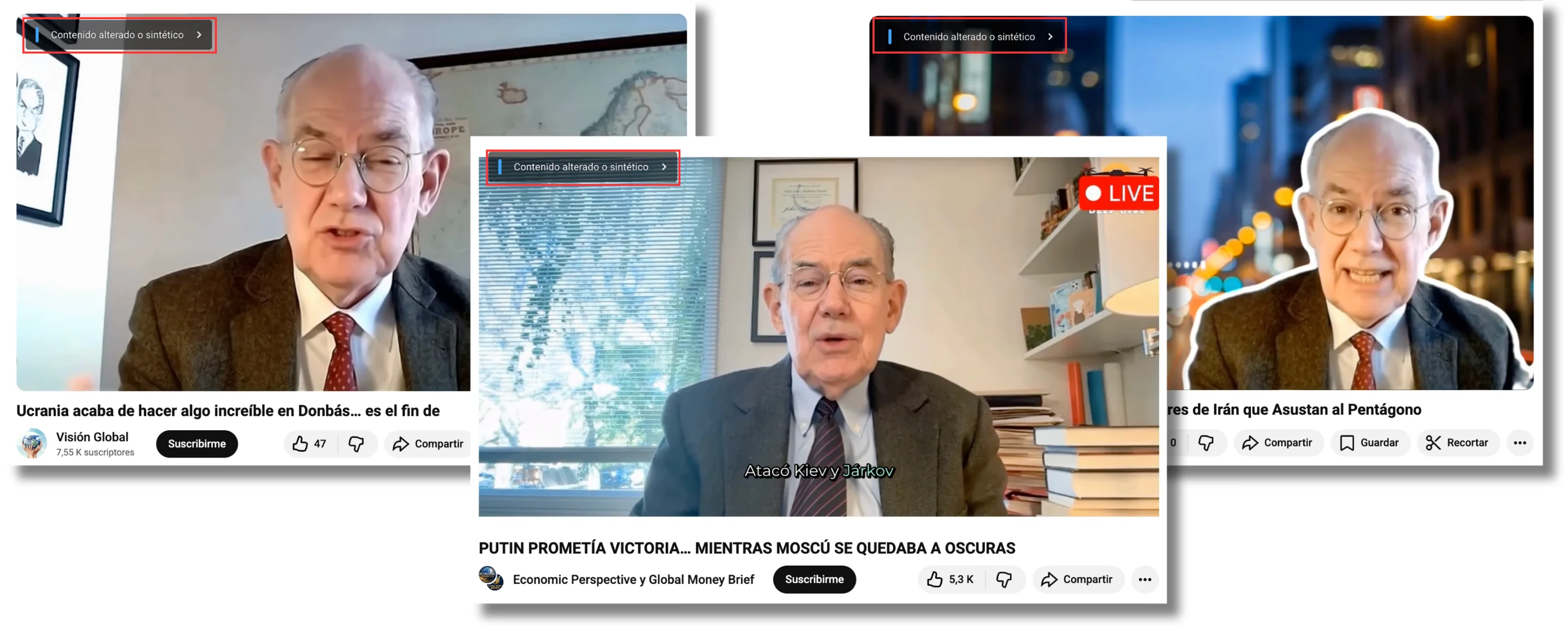“Tengo un problema importante con la gente que publica vídeos falsos de IA míos en internet”, escribía Mearsheimer el 5 de febrero de 2026 en un post de Substack. Algunos son tan realistas, cuenta, que incluso personas de su entorno “no se dan cuenta de que están viendo una falsificación”. Explica a Maldita.es que era consciente de la circulación de deepfakes con su imagen en inglés y en chino, —detectó un total de 43 canales—, pero no sabía de la existencia de estos contenidos en español. “En algunos de estos vídeos digo cosas que nunca dije ni diría”, añade Mearsheimer.