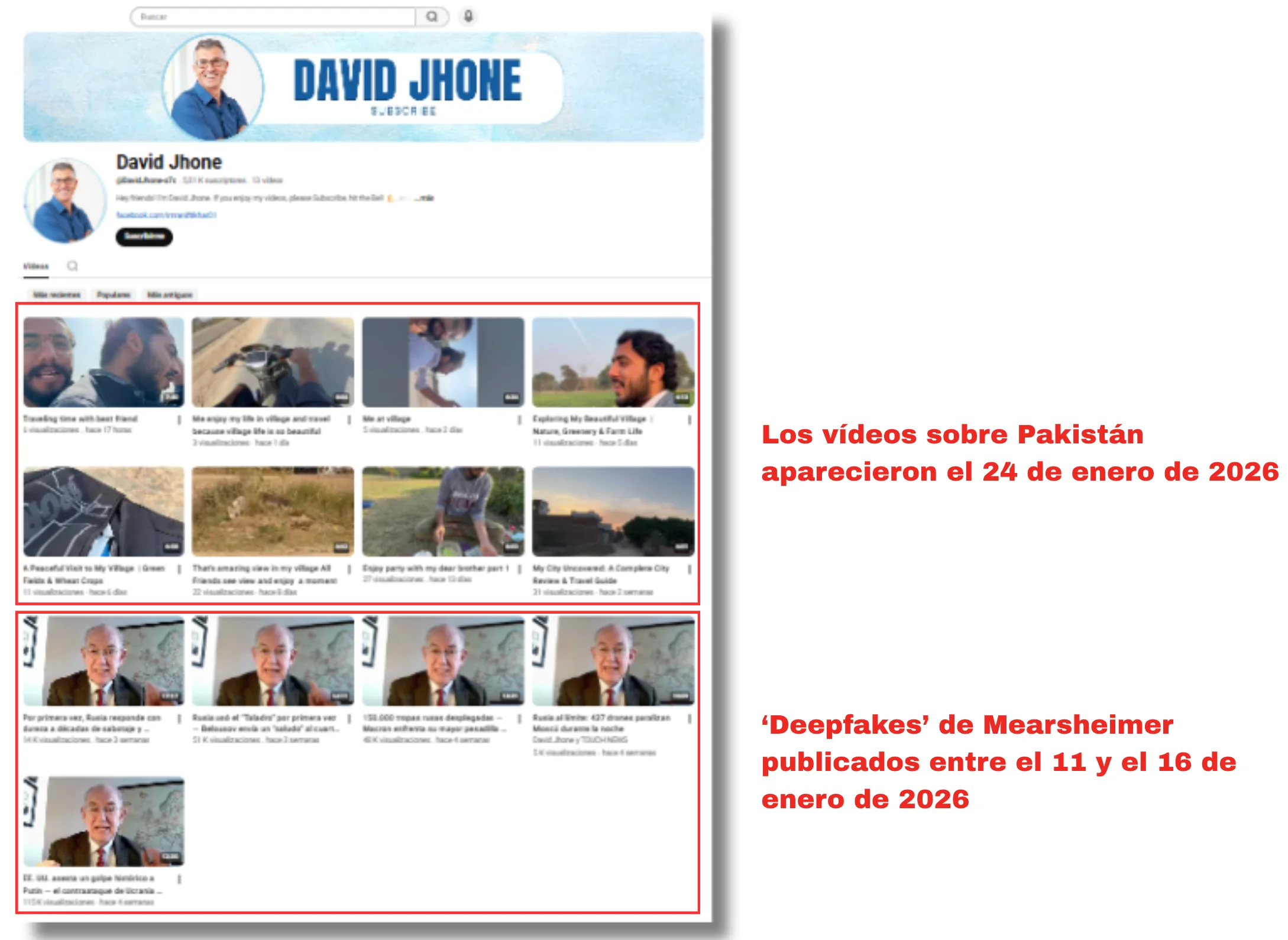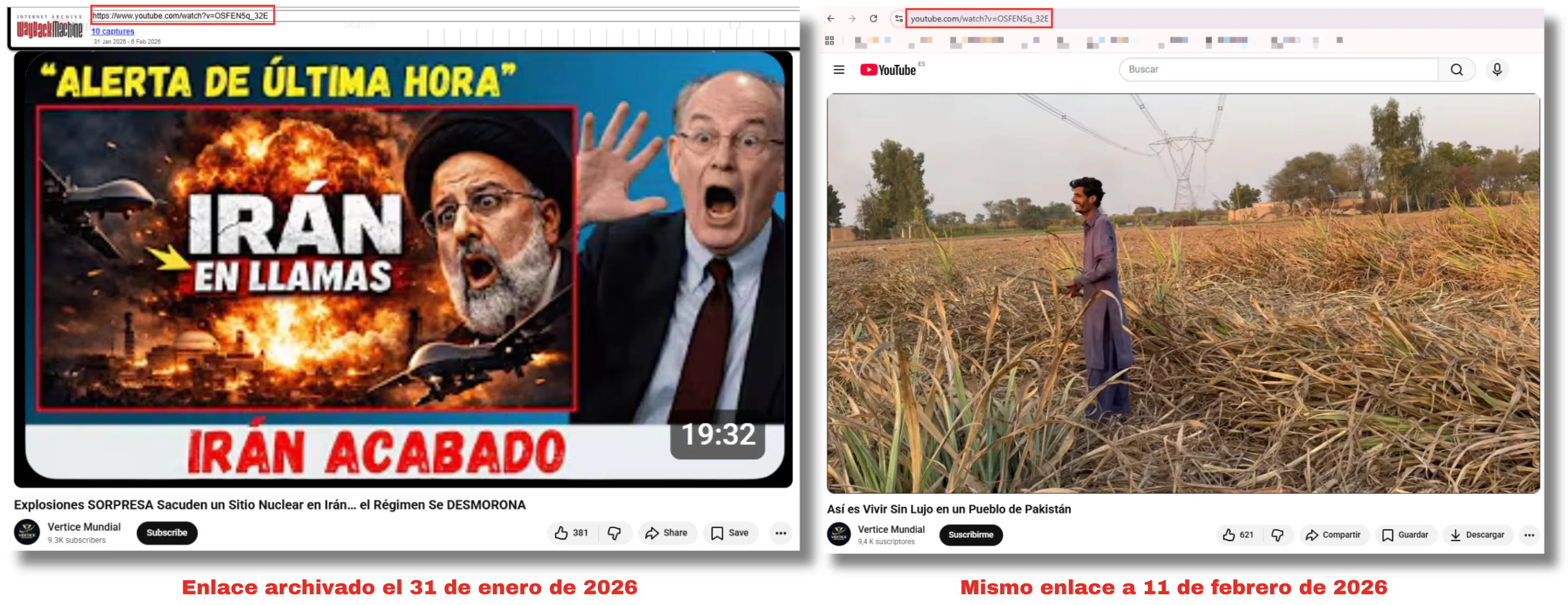 No solo han publicado más vídeos sobre Pakistán. También han cambiado el contenido de publicaciones antiguas. En varios ejemplos se ha mantenido el enlace original (además de otros parámetros como las visualizaciones o fecha de publicación), pero el contenido del vídeo ha cambiado por completo. Un ejemplo es el ahora titulado "Así es Vivir Sin Lujo en un Pueblo de Pakistán", que anteriormente se llamaba "Explosiones SORPRESA Sacuden un Sitio Nuclear en Irán… el Régimen Se DESMORONA". Se publicó el 31 de enero de 2026 y pasó de mostrar un deepfake en español de Mearsheimer a un vídeo de varios hombres en un campo.