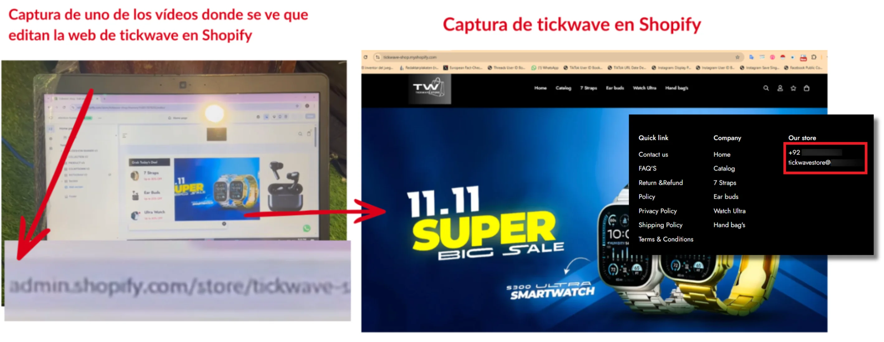Estos vídeos, así como otros datos, indicarían que estarían operando desde ese país. En uno de los ordenadores se ve cómo editan una web en Shopify llamada tickwave cuyo teléfono tiene un prefijo de Pakistán (+92).