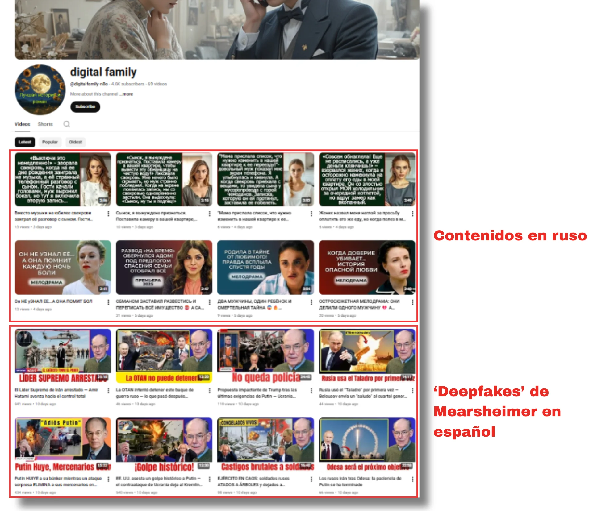 Este tipo de contenidos (hasta ahora mayoritarios) han dado paso a otros vídeos con temáticas completamente diferentes, sin relación aparente y con otros formatos. En palabras de Rafael González, una vez el canal ha conseguido visibilidad con este tipo de contenidos, dejan de ser necesarios y pasan a representar un riesgo. “Su eliminación y sustitución por vídeos sin relación aparente permite conservar el canal como activo digital mientras se reducen las probabilidades de denuncias o sanciones”, afirma. En Maldita.es hemos podido comprobar que durante este análisis se han eliminado o sustituido decenas de deepfakes de Mearsheimer, que según el experto se utilizó para “activar el canal” y en ningún momento fue “el final de la operación”.