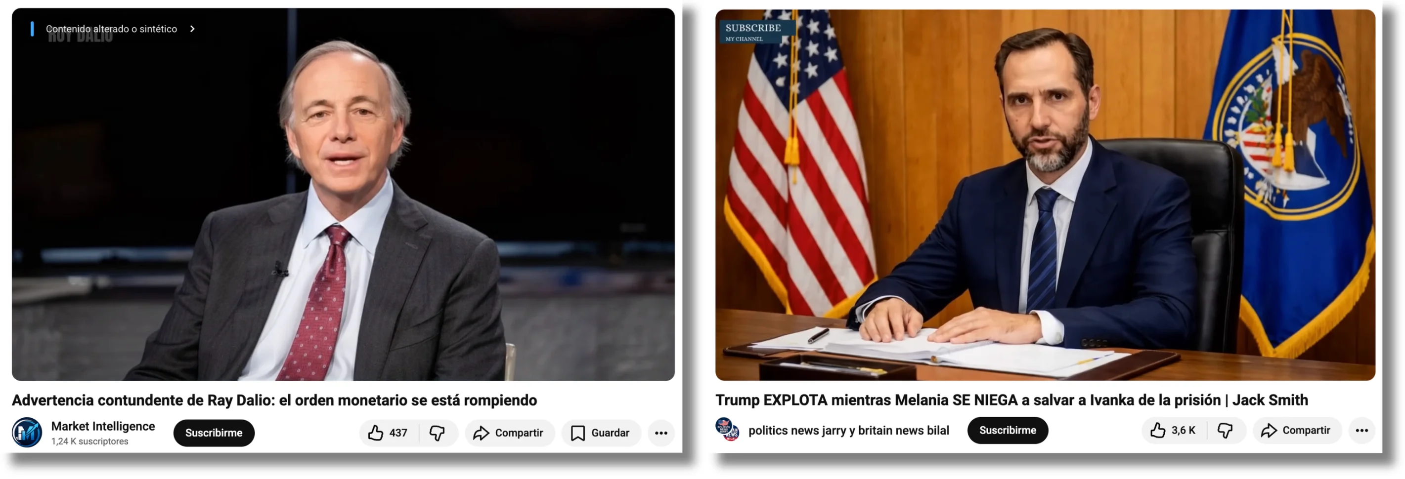 Mearsheimer no es el único experto del que se han creado deepfakes en YouTube. En esta misma red de canales hemos encontrado decenas vídeos en español del gestor e inversor de fondos estadounidense Ray Dalio. En menor medida, han publicado vídeos de otras personalidades como Jack Smith, ex Fiscal Especial para el Departamento de Justicia de los Estados Unidos; Piers Morgan, periodista británico, víctima de deepfakes desde hace años; o Norbey Marin, psicólogo clínico y youtuber venezolano, entre otros. Todos ellos presentan también indicios de haber sido generados con alguna herramienta de inteligencia artificial. Como en los ejemplos protagonizados por Mearsheimer, ni los movimientos ni la voz del experto son naturales.