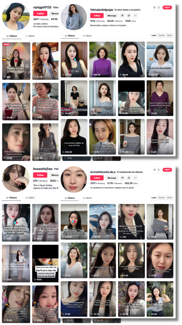 Se amplió el análisis más allá del contexto español mediante búsquedas equivalentes en otros idiomas. Utilizando términos como "busco marido" combinados con las nacionalidades de diferentes países en el buscador de TikTok, identificamos fenómenos similares en italiano, alemán, francés y portugués, todos siguiendo el mismo patrón: uso de mujeres asiáticas como reclamo y redirección a canales externos para solicitar dinero.