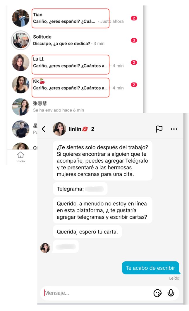 Al contactar con estos perfiles, te preguntan si eres español y qué edad tienes (con frases casi idénticas) para poco después redirigirte a Telegram, una plataforma que brinda a los estafadores anonimato, privacidad y falta de moderación de contenido ilegal, como venta de armas, dinero falso o venta de material de abuso infantil. Telegram asegura que no están permitidas actividades reconocidas como ilegales en la mayoría de los países, aunque no especifica las medidas concretas de moderación que lleva a cabo en esos casos.