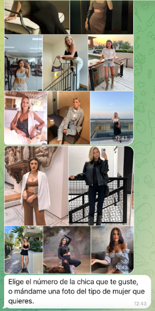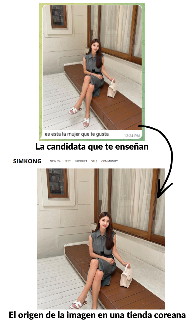 Una vez en Telegram, la sorpresa es que no hablas con la chica del perfil de TikTok, sino con una intermediaria que se define a sí misma como “agente de acompañantes” y te pregunta qué buscas: “Compañera sexual” o novia, rango de edad deseado y preferencias de aspecto. Esta agente te envía una veintena de fotos de distintas mujeres en posturas y con vestimentas sexualizadas (o incluso desnudas) junto al mensaje: “Elige el número de la chica que te guste o envíame una foto del tipo de mujer que quieres”. No obstante, al hacer una búsqueda inversa de estas imágenes, vemos que algunas proceden de perfiles de redes sociales como Instagram, TikTok e incluso páginas de pornografía u otros sitios web. Por ejemplo, una de las mujeres aparece como modelo en una página de venta de ropa coreana.