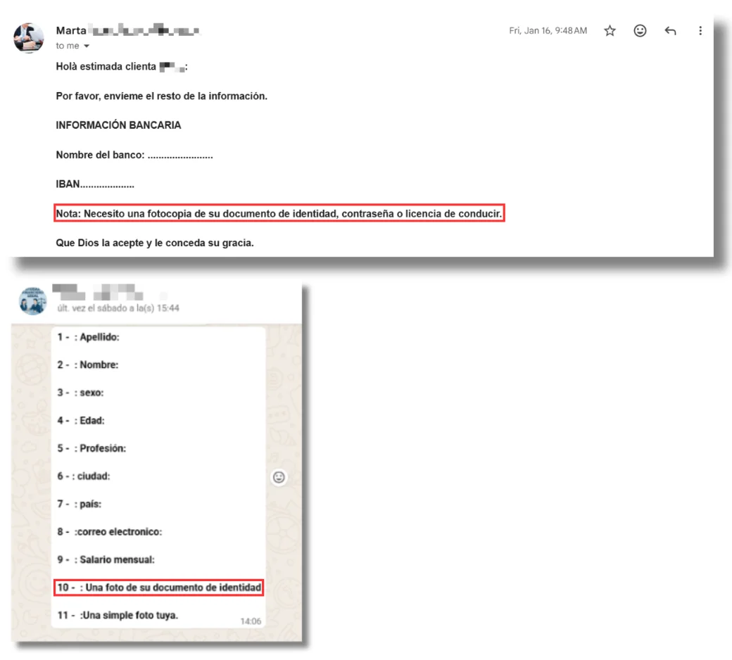 Desde la Asociación de usuarios financieros (ASUNIF) aseguran a Maldita.es que para solicitar un préstamo en España hay que presentar cualquier “documentación tendente a acreditar solvencia que se demande por el banco”. Lo más frecuente, explican, es: DNI o NIE en vigor, un justificante de domicilio (que puede ser, por ejemplo, un recibo de luz), extractos bancarios recientes, últimas nóminas (normalmente una o tres) si trabajas por cuenta ajena o la última declaración de la Renta (IRPF) y los pagos trimestrales de IVA si eres autónomo. Únicamente en unas pocas conversaciones nos exigieron enviar una imagen de nuestro DNI. Un documento que, por sí solo, no es suficiente para solicitar un préstamo, pero que los timadores pueden utilizar para suplantar nuestra identidad con fines como estafar a otras personas o realizar trámites en nuestro nombre.