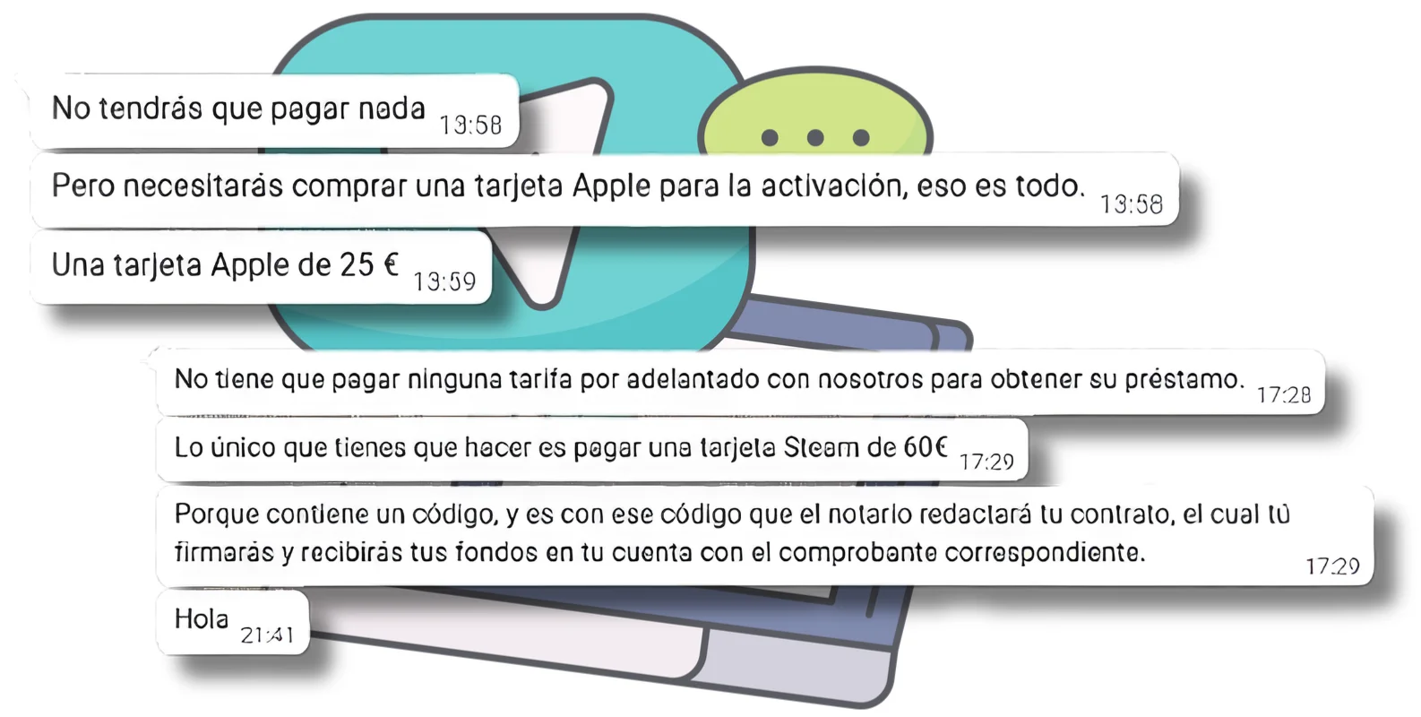 En dos ocasiones nos explicaron que estos pagos debíamos hacerlos ingresando dinero en unas tarjetas de regalo, que pueden utilizarse para comprar bienes o servicios de una determinada tienda o plataforma. Un perfil nos pidió que cargáramos 60 euros en una tarjeta Steam. Otro, 25 euros en una tarjeta de Apple. Después de realizar estos ingresos tendríamos que enviarles el código de estas tarjetas (con el que se puede canjear el dinero introducido en las mismas) para “redactar el contrato” o para “activar” el supuesto préstamo. Este formato de estafa es habitual y ya hemos advertido de ello antes.