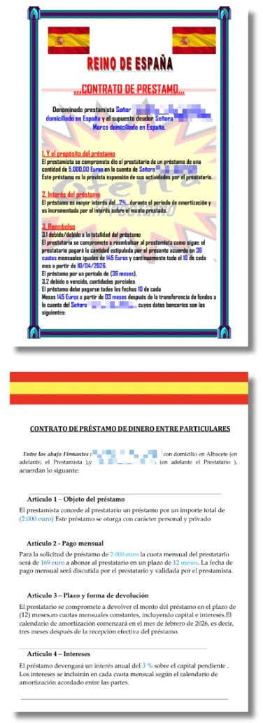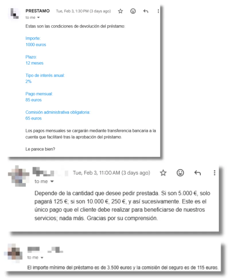 María (nombre ficticio) estaba intentando conseguir crédito y acudió a internet. Unos supuestos asesores de una empresa de préstamos contactaron con ella a través de WhatsApp y le enviaron, por correo electrónico, un supuesto contrato de crédito que contenía el logotipo de una reconocida entidad bancaria. Le exigieron una transferencia en concepto de comisiones por apertura del crédito. Ella pagó. Además, había proporcionado información personal: una fotografía de su DNI, una factura de la luz, su firma en un documento, número de teléfono, correo electrónico y cuenta bancaria. No consiguió ponerse en contacto de nuevo con los supuestos prestamistas, que habían desaparecido sin ingresarle ni un euro.
