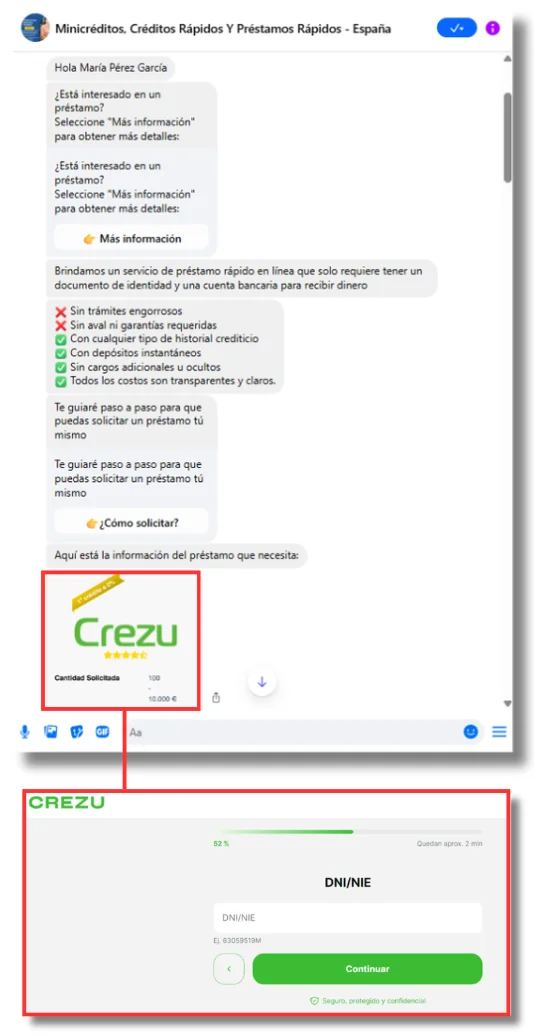 Más de un tercio de estos perfiles (38) tienen el mismo correo electrónico en el apartado de información de contacto. Hemos escrito a casi la mitad de estas cuentas (16) a través de Messenger, la aplicación de mensajería instantánea de Meta, y todas nos respondieron de forma automática con exactamente los mismos mensajes. En éstos, se nos derivó a una página web llamada Crezu para tramitar nuestra solicitud de préstamo. Se trata de un comparador de préstamos online en el que hay que rellenar una “breve solicitud” con información personal como nombre completo, correo electrónico, número de teléfono, fecha de nacimiento y DNI.