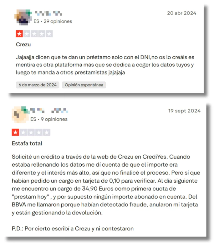 “Estaba buscando préstamos personales online y encontré Crezu. Ha sido la mejor decisión que he tomado para pedir un préstamo al tener una situación complicada, en menos de 15 minutos tenía el dinero”, se puede leer en la reseña de un supuesto cliente de este comparador. Todas las opiniones visibles en esta página web puntúan el servicio con 4 o 5 estrellas (el máximo). Sin embargo, en Trustpilot tiene una media de 2,2 estrellas. Los usuarios dicen que Crezu redirige a otros comparadores después de “quedarse con tus datos personales” y el crédito al que se puede optar es pequeño, con intereses altos y a devolver en poco tiempo.