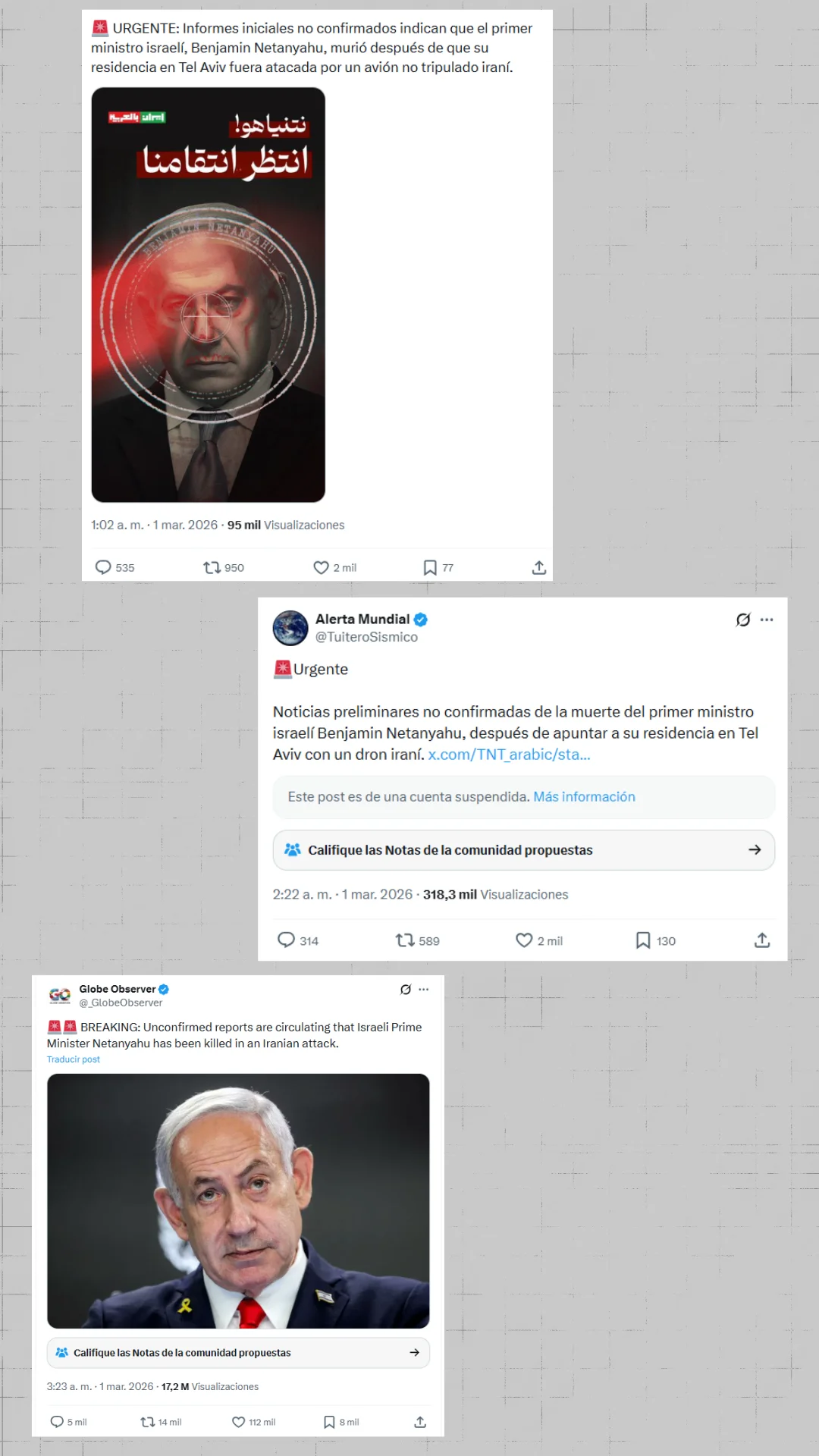 Los primeros tuits aparecen en las primeras horas del día 1 de marzo. Pasados dos minutos de la 1 de la mañana (hora peninsular española), un usuario localizado en México publica un tuit que dice: “URGENTE: Informes iniciales no confirmados indican que el primer ministro israelí, Benjamín Netanyahu, murió después de que su residencia en Tel Aviv fuera atacada por un avión no tripulado iraní”.