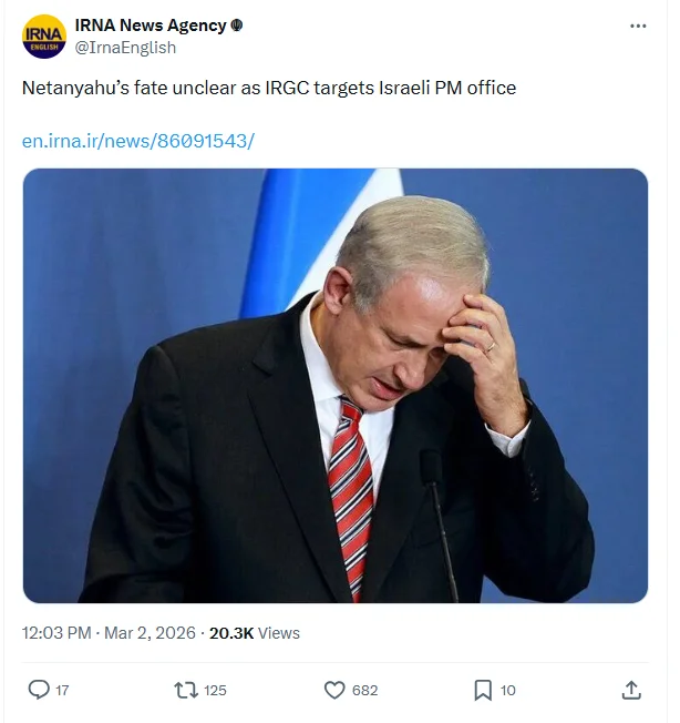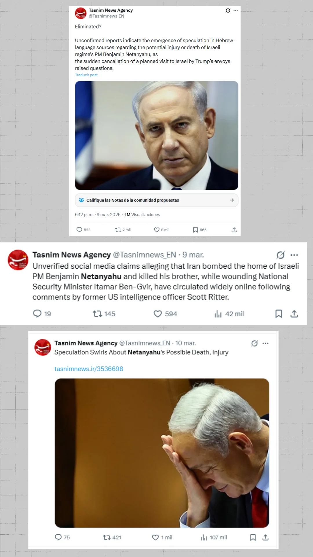 En estos días, distintas publicaciones vinculadas o alineadas con el régimen iraní también han participado en la difusión de la teoría conspirativa de la muerte de Netanyahu. Los días 9 y 10 de marzo, Tasnim News Agency, vinculada al Cuerpo de la Guardia Revolucionaria Islámica (CGRI), contribuyó a la difusión de esta conspiración con publicaciones como: “Informes no confirmados indican el surgimiento de especulaciones en fuentes en idioma hebreo sobre la posible lesión o muerte del primer ministro del régimen israelí, Benjamín Netanyahu”.