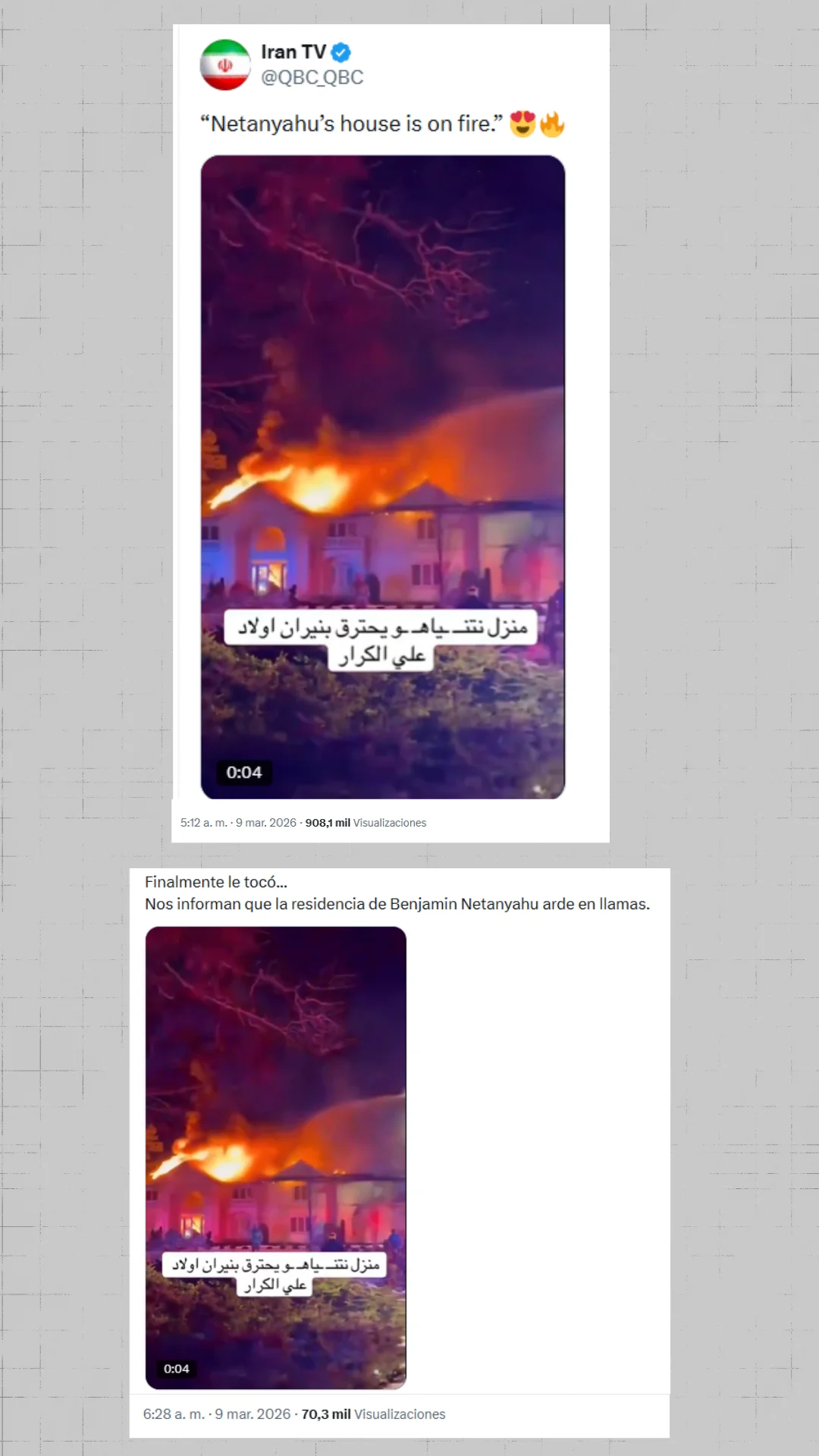En los días siguientes distintas desinformaciones iban precisamente en esa línea y en Maldita.es verificamos varios vídeos e imágenes sacados de contexto, es decir grabados en otro lugar y/ o en otro año. Por ejemplo, el día 9 de marzo se publicó un vídeo de un incendio afirmando que se trataba de “la residencia de Benjamín Netanyahu en llamas”. Realmente se trataba de unas imágenes de Nueva Jersey (Estados Unidos) de febrero de 2026. Fue verificado por fact-checkers de España, Portugal, India, Noruega, Francia o Turquía, entre otros, lo que indica que se difundió en múltiples países e idiomas. Los contenidos afirmaban que en ese supuesto incendio también habría muerto el hermano menor del primer ministro de Israel, Iddo Netanyahu.