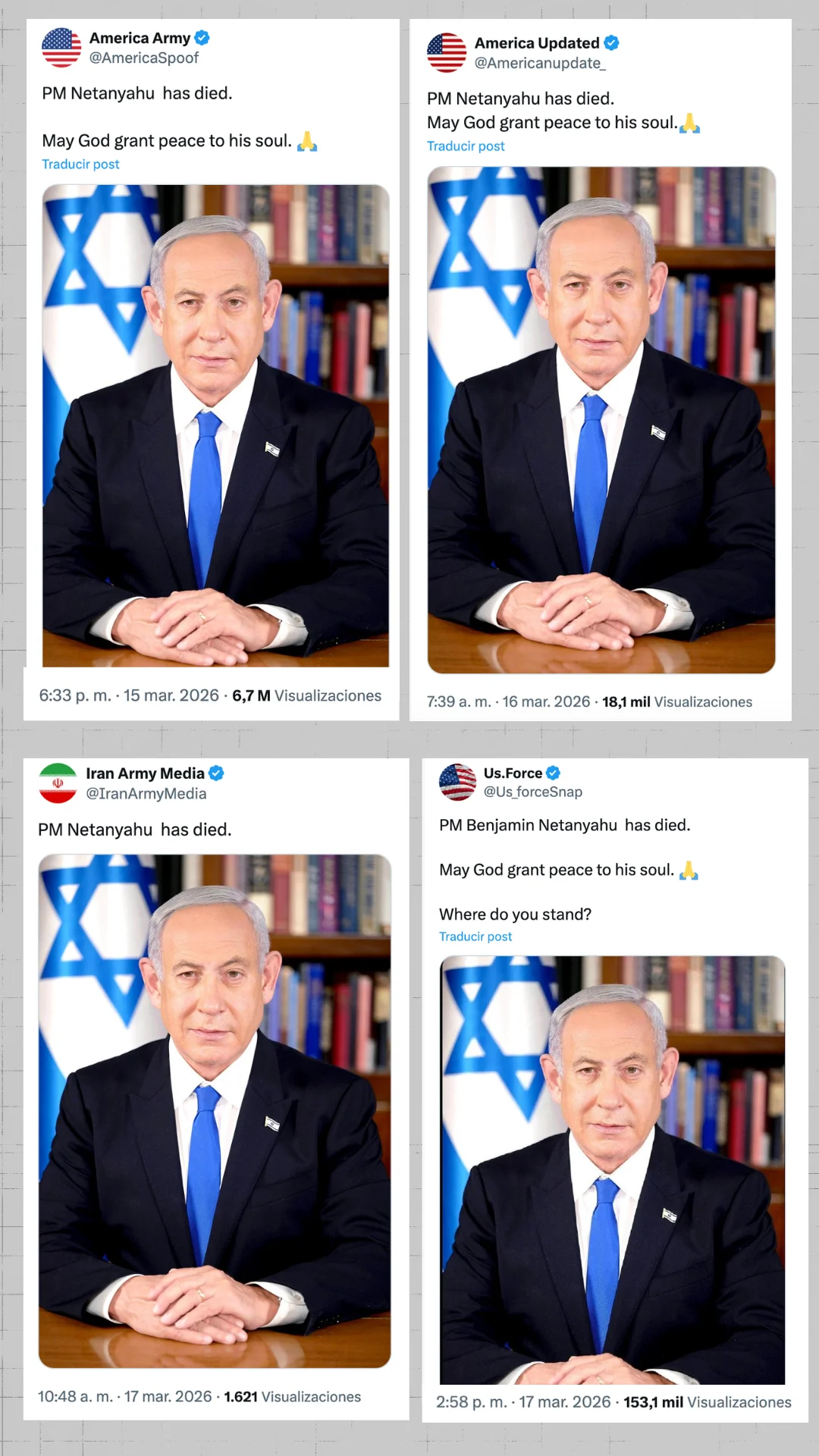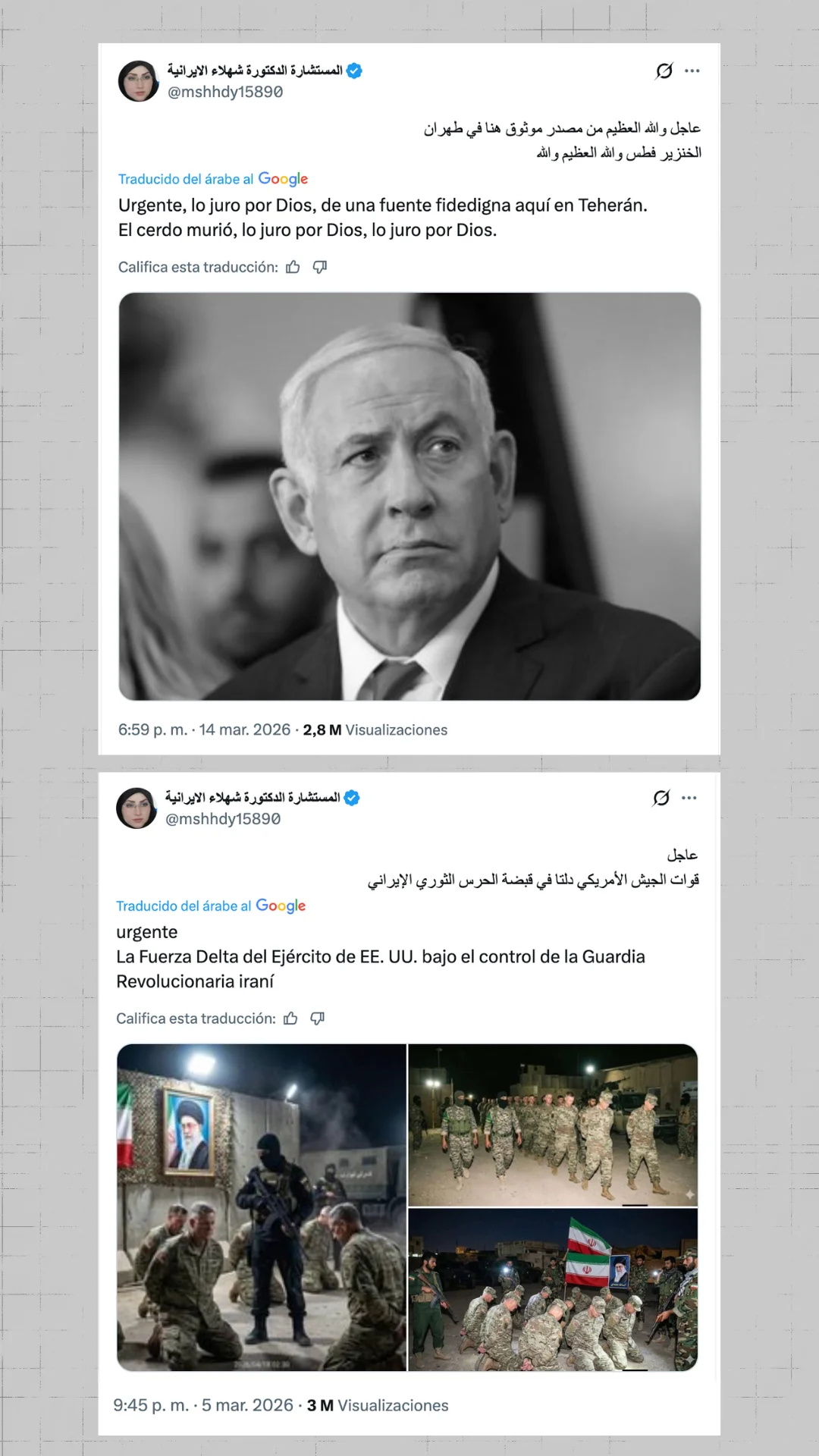 También destaca en la escalada de esta conspiración la publicación del usuario @mshhdy15890, cuenta que ha pagado por el tick azul en X y localizada en Asia occidental. El 14 de marzo publicó un tuit con el texto: “Urgente, lo juro por Dios, de una fuente fidedigna aquí en Teherán. El cerdo murió, lo juro por Dios, lo juro por Dios” y una foto del primer ministro israelí. La publicación ya tiene casi tres millones de visualizaciones a fecha de publicación de este artículo. Se trata de una cuenta que se define como “pro-iraní” y que ya ha publicado otras desinformaciones como la imagen con indicios de haber sido creada con IA de militares estadounidenses arrodillados ante la bandera de Irán y una foto del ayatolá fallecido tras los ataques del 28 de febrero, Alí Jamenei. Precisamente, la localizamos como la primera cuenta que difundió esa desinformación sobre los supuestos soldados de la que hay constancia.