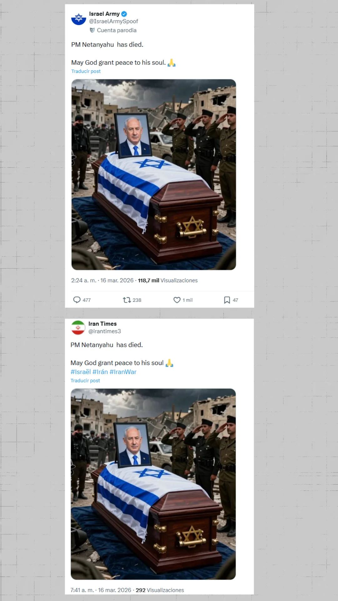 Otros usuarios han publicado textos similares y una imagen de una foto de Netanyahu encima de un ataúd.
