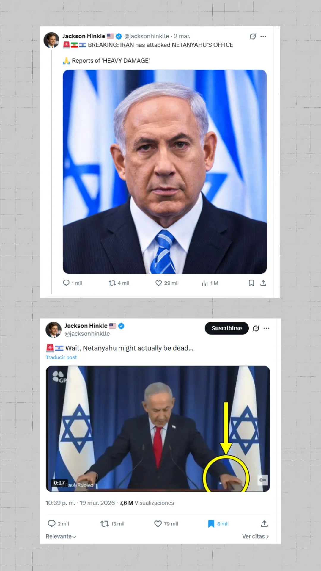 A 20 de marzo de 2026 la teoría conspirativa de que Netanyahu está muerto no ha cesado y usuarios como Jackson Hinkle, comentarista político estadounidense que ha sido mencionado como desinformador por otras organizaciones como AFP o por el periodista de BBC Verify, Shayan Sardarizadeh, y que cuenta con más de tres millones de seguidores, siguió alimentando la teoría con posts como: “Espera, Netanyahu podría estar muerto…”, de nuevo insistiendo en que el vídeo podría estar hecho con IA.