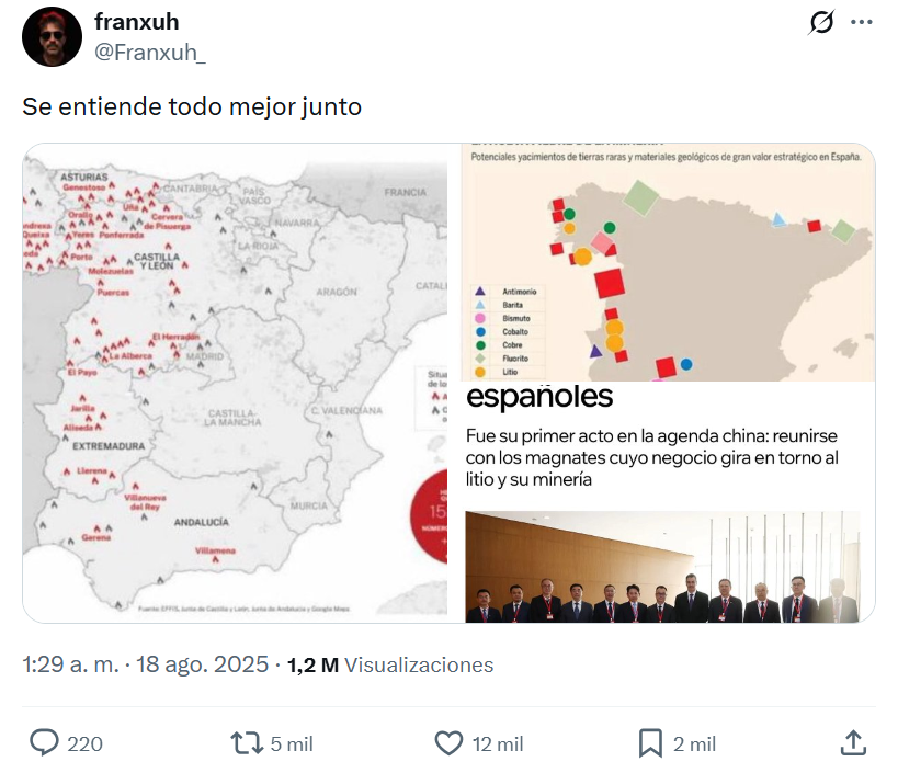 El 16 de agosto por la tarde, una usuaria de X publica varios mensajes comparando la cercanía de los incendios a yacimientos de tierras raras con la ayuda de ChatGPT. Esta es la primera aparición de mensajes asociados a esta narrativa de los que Maldita.es tiene constancia. Esa noche ElDiestro, una cuenta de Telegram, publica un mapa de los incendios y otro de yacimientos de tierras raras en España acompañados de la frase “estos son los verdaderos motivos de los pirómanos”. El mensaje enlaza a un vídeo de YouTube donde comenta los tuits de la usuaria anterior. En conjunto, esas tres publicaciones no superan las 30.000 visitas. Un día y medio después, el 18 de agosto a la 1:29 de la madrugada, otro usuario transmite la misma idea en X usando los mismos mapas que ElDiestro y la noticia de una reunión entre Pedro Sánchez y los magnates chinos del litio. El tuit alcanza más de un millón de visitas.