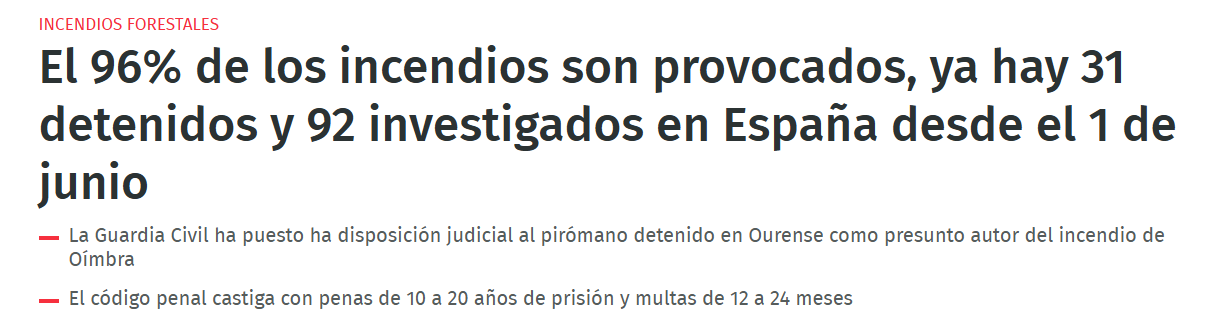 Ese mismo 17 de agosto se publicaron titulares diciendo que “el 96% de los incendios son provocados” junto con cifras de personas detenidas. Sin embargo, en las estadísticas oficiales no existen los incendios “provocados”, sino aquellos con causas naturales (como los rayos), los producidos por accidentes o negligencias y los intencionados. Ese 96% viene de agrupar los fuegos no naturales en las estadísticas históricas del MITECO, pero según los últimos datos disponibles con estadística definitiva, que recogen el período de 2011 a 2021, los fuegos intencionados son el 55% de media, pasando del 62% en 2011 al 52% en 2021.