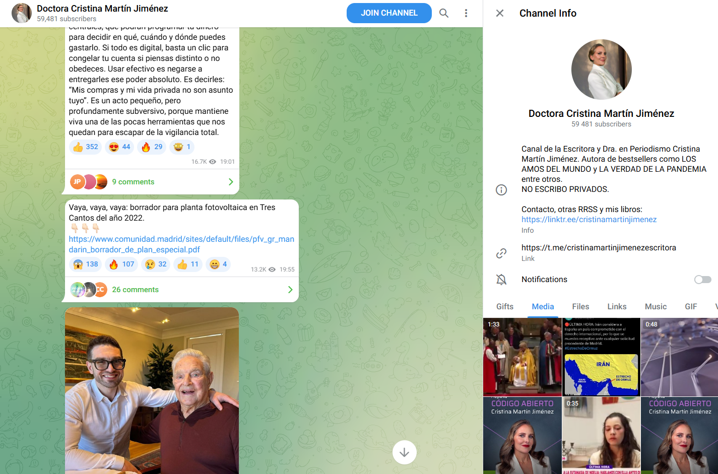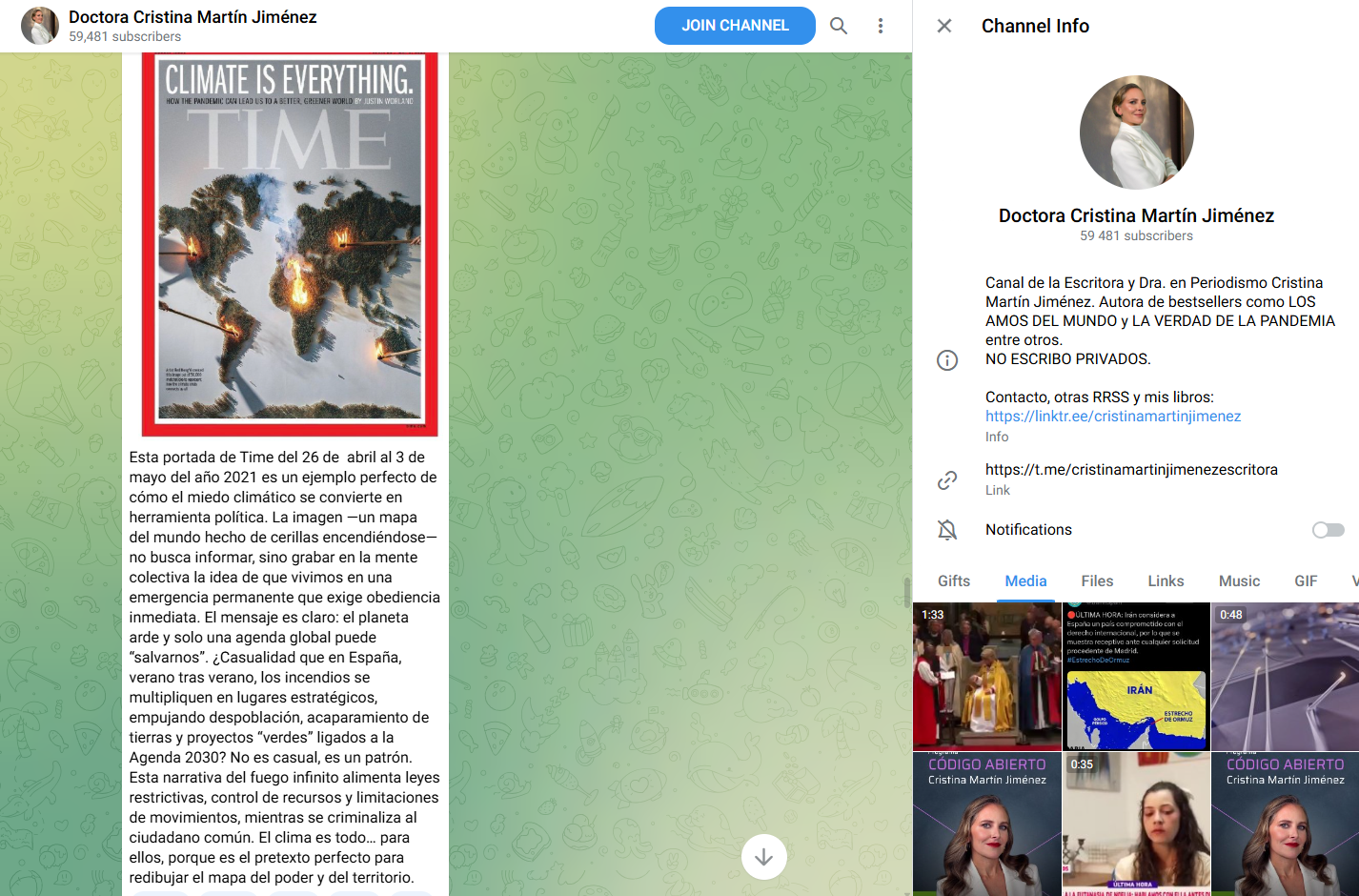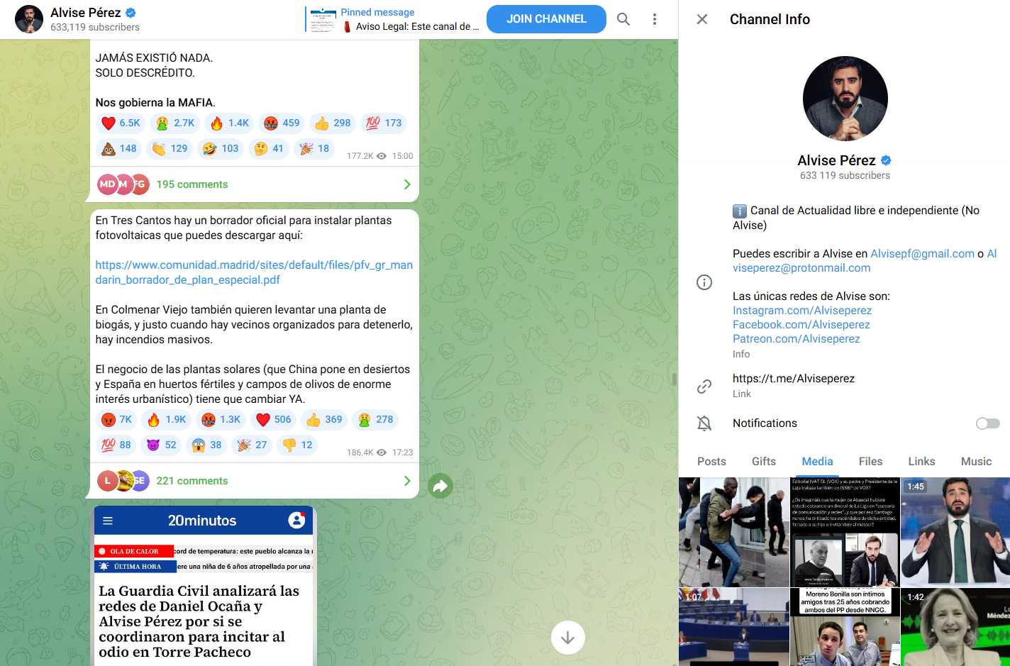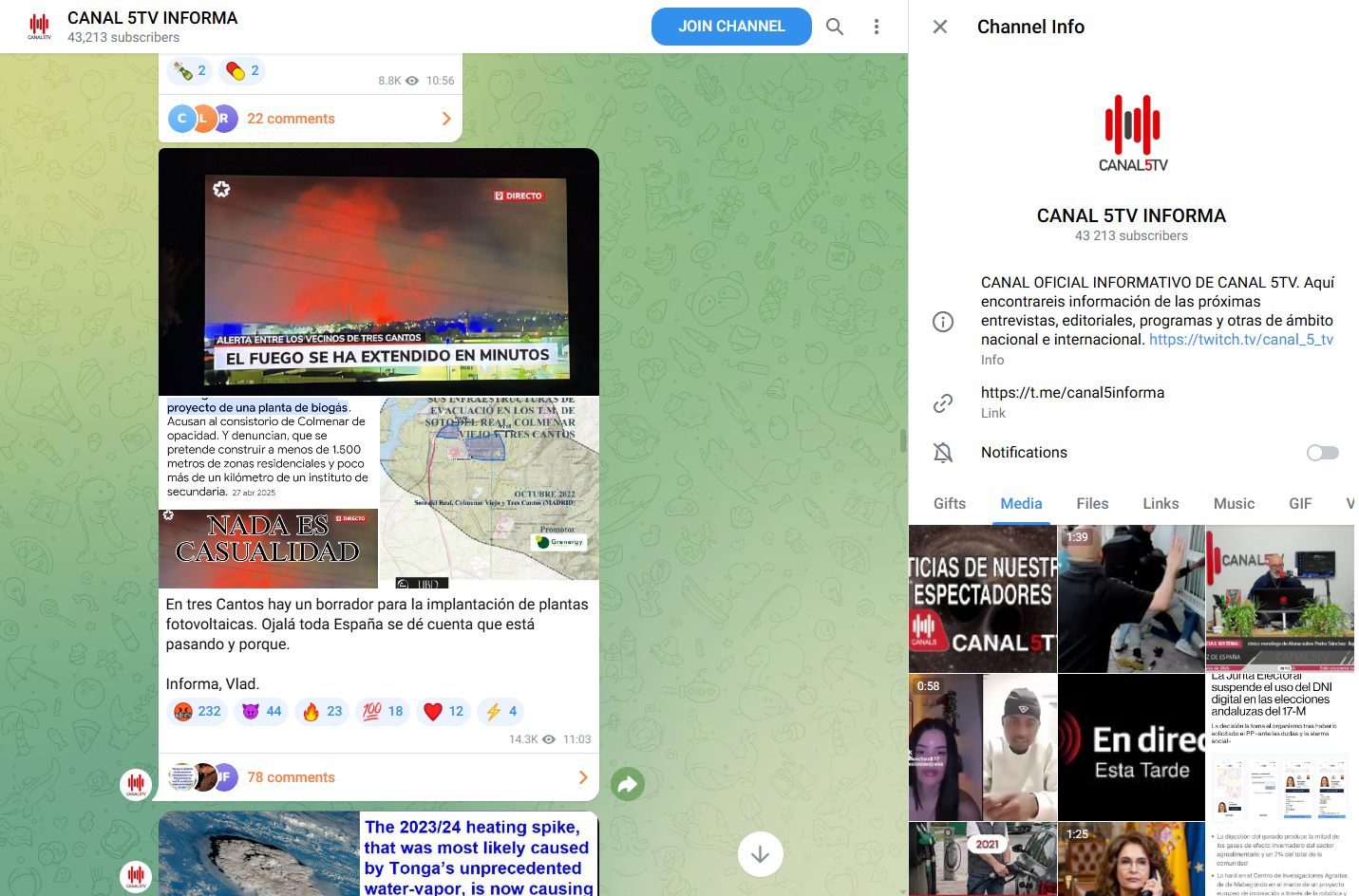 Ese 11 de agosto comienza otro incendio en Tres Cantos, una ciudad al norte de Madrid, en un punto muy cercano a las viviendas. El fuego arrasa 1.500 hectáreas y provoca la muerte de 150 ovejas, 18 caballos y el hombre que intentaba salvarlos. El 12 de agosto a las 11:03, el canal de Telegram CANAL 5TV INFORMA publica un mensaje asociando el fuego con un proyecto fotovoltaico en un municipio cercano. A las 17:23, el eurodiputado Alvise Pérez habla en la misma red de ese proyecto y otro de biogás, alcanzando 186.000 visualizaciones. Cerca de las 20:00, la escritora del libro “Agenda 2030, libertad o tiranía”, Cristina Martín Jiménez, publica en Telegram y X la frase “vaya, vaya, vaya: borrador para planta fotovoltaica en Tres Cantos del año 2022”, llegando a 130.000 usuarios en total. En realidad, la planta solar había conseguido su permiso de construcción en 2024, por lo que el incendio no aportaba ventajas a su tramitación. El 17 de agosto, tres cuentas de Instagram viralizan este caso, alcanzando a 241.000 usuarios.